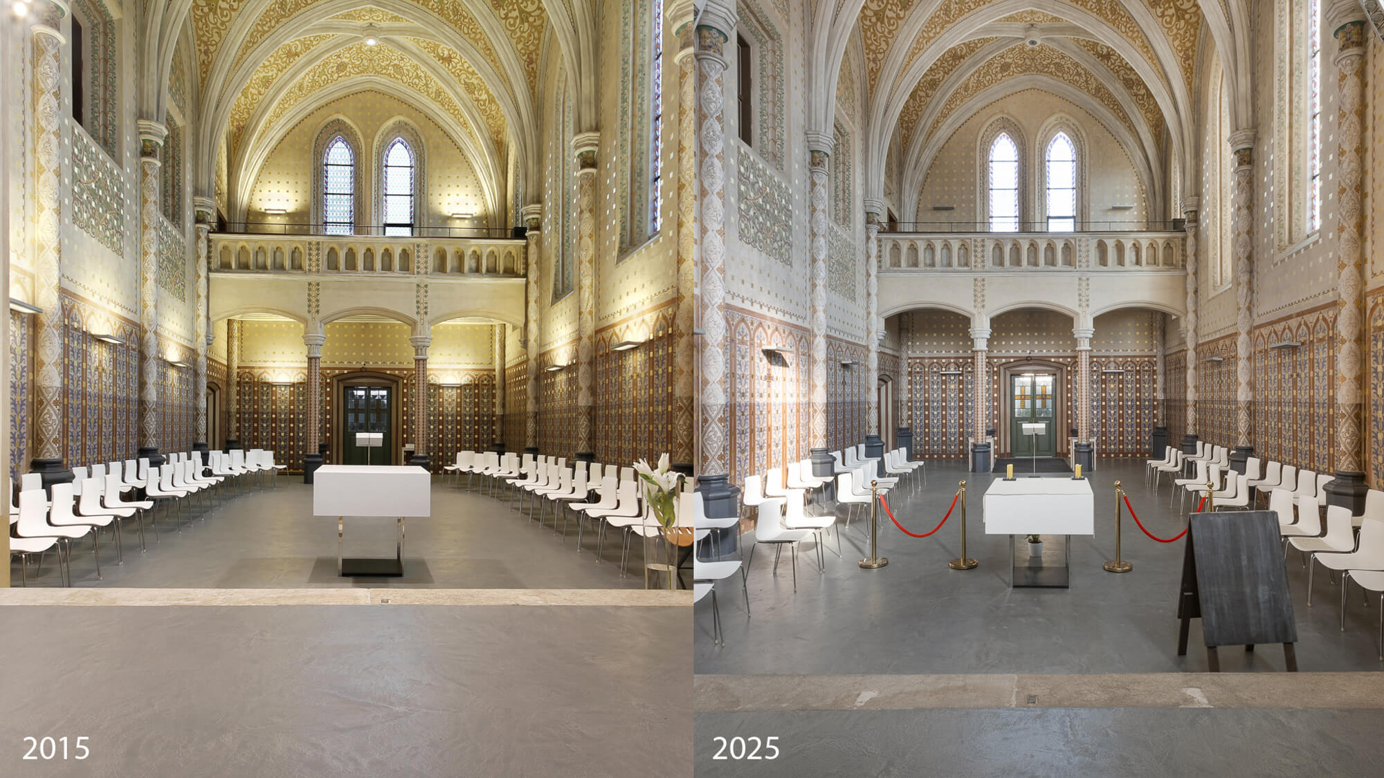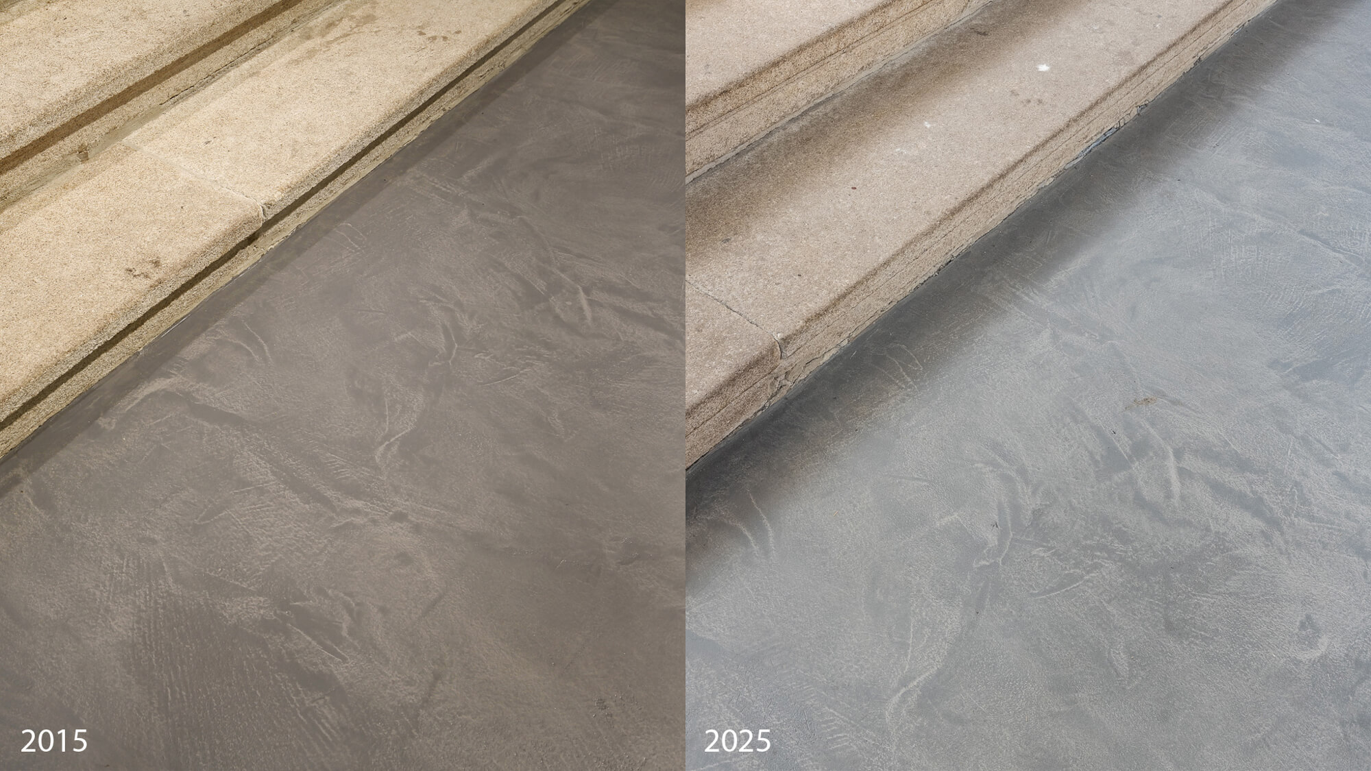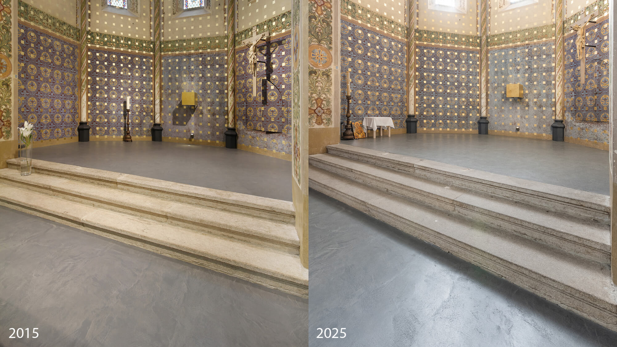 Kostely patří mezi prostory s vysokou návštěvností a podlaha zde čelí intenzivnímu zatížení. Navíc jde o historickou budovu, kde se mění vlhkost i teplota, což může u některých materiálů způsobovat postupné opotřebení. Po deseti letech provozu jsme se na místo vrátili, abychom zjistili, jak si Betonepox® vedl v reálných podmínkách.