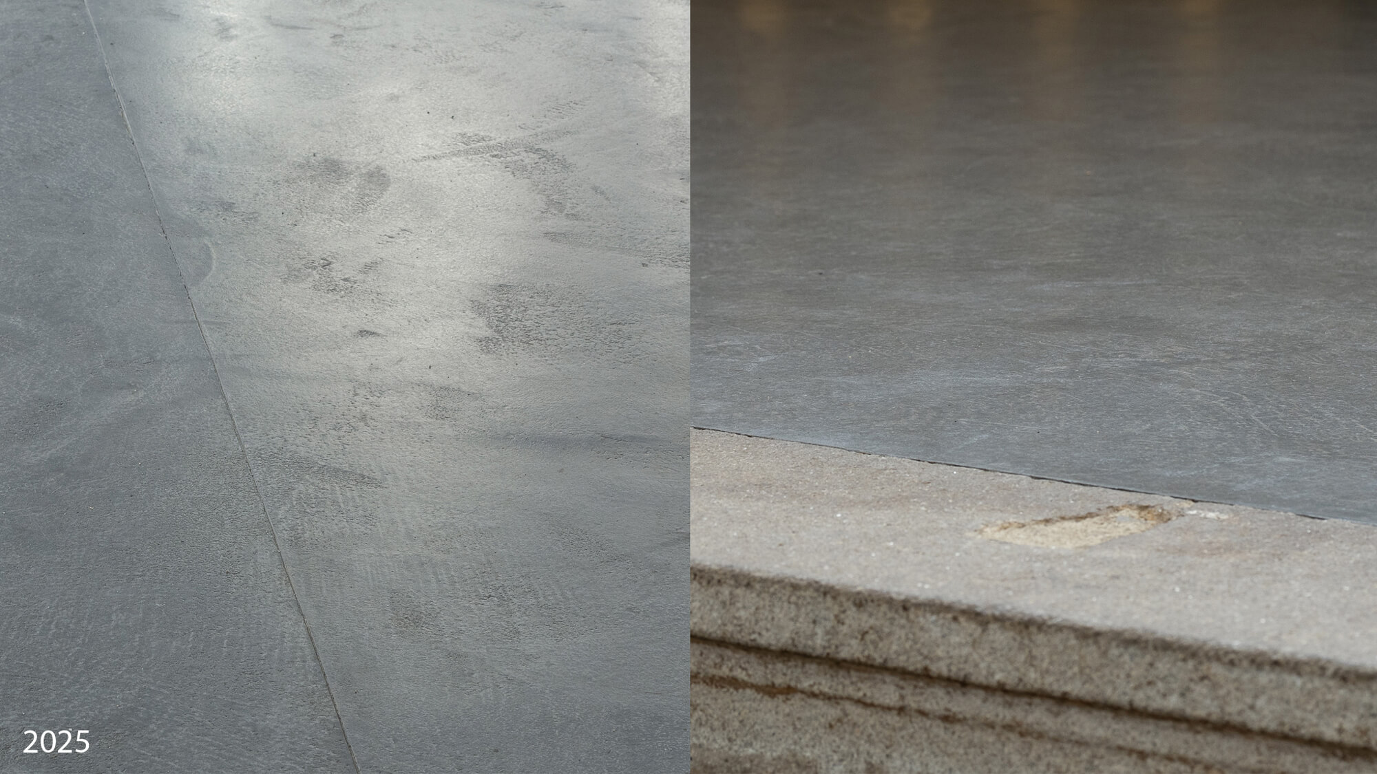 Výsledek? Povrch si zachoval svůj původní vzhled i funkčnost a evidentně nedošlo k žádným viditelným změnám. Na podlaze jsme zaznamenali jedinou rýhu, kterou pravděpodobně způsobil těžký předmět tažený po povrchu – zřejmě s kamínkem zaseknutým pod ním. Takové poškození by se objevilo i na jakémkoli jiném materiálu. Jemná struktura stěrky jinak zůstala neporušená a podlaha stále působí elegantně a harmonicky v kontextu historického interiéru.