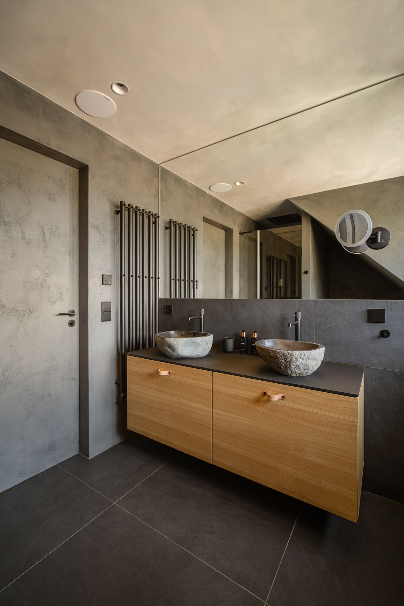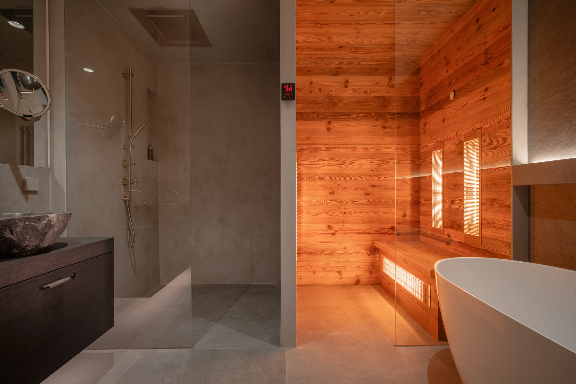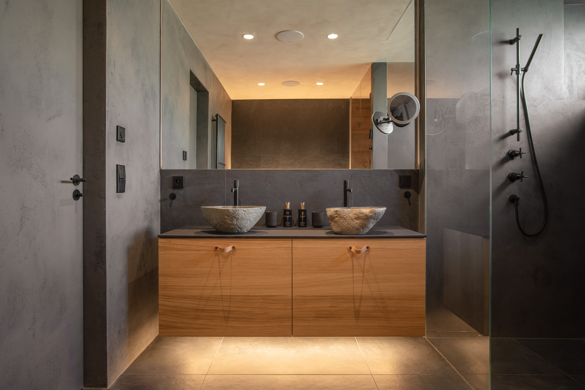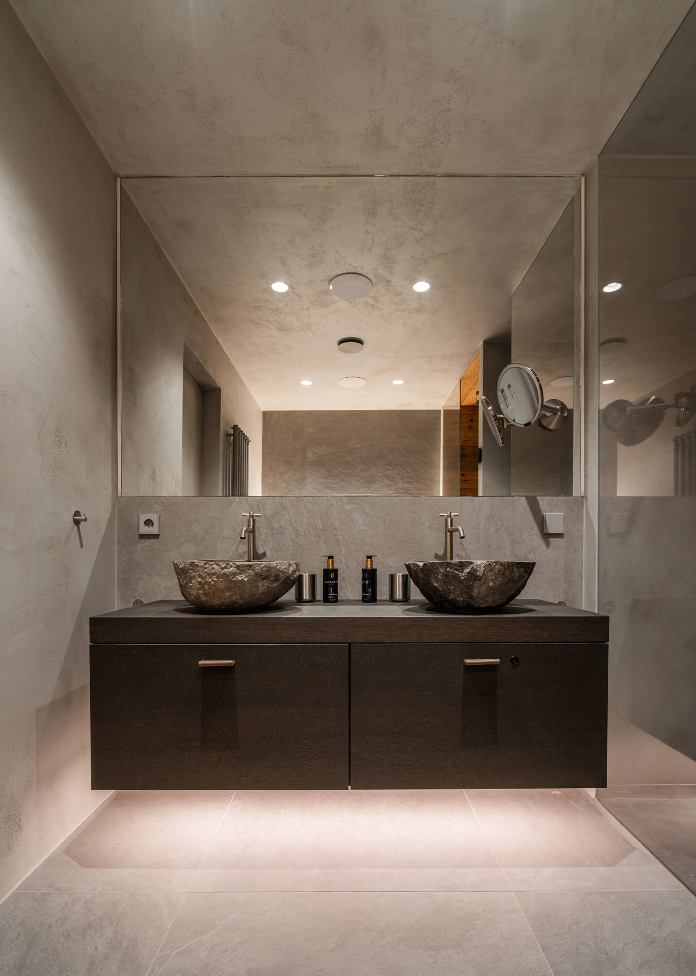 V projektu 2PEAKS jsme realizovali epoxidovou stěrku Betonepox® na podlahách, stěnách a stropech vybraných částí apartmánů, zejména v koupelnách. Betonepox® vyniká vysokou odolností, dlouhou životností a snadnou údržbou, což z něj činí ideální řešení pro moderní interiéry. Nadčasový betonový vzhled se přirozeně doplňuje s použitým dřevem a společně podtrhují klidný, vyvážený charakter prostoru.