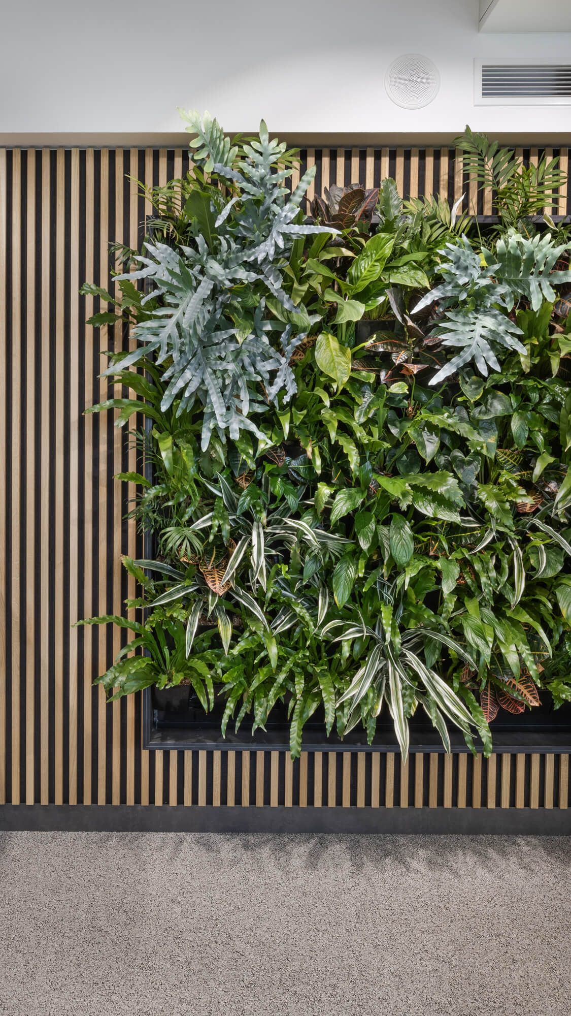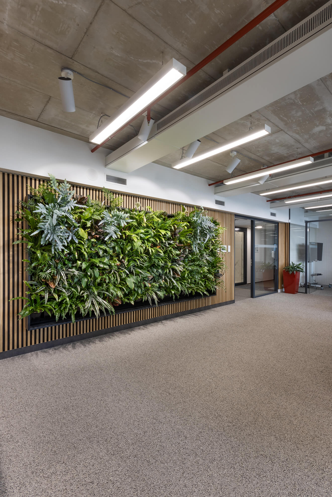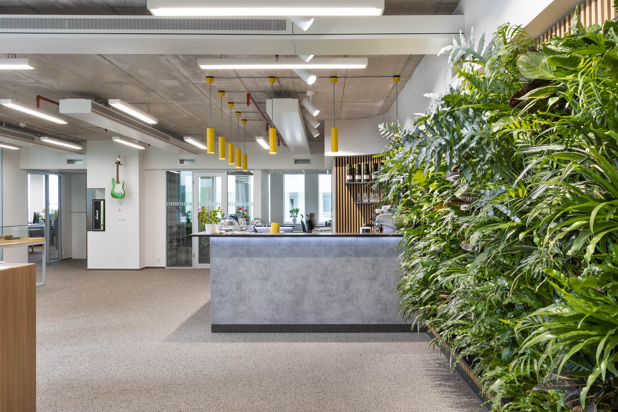 Recepce v areálu Slatina v Brně je doplněna vertikální kaskádovou zahradou Cascade Garden®, která se stala přirozenou součástí interiéru. Zelený prvek zjemňuje technický charakter prostoru, přispívá k příjemnější atmosféře a kultivuje první dojem při vstupu do budovy. Realizace propojuje moderní architekturu se systémem Cascade Garden® citlivým a nadčasovým způsobem.