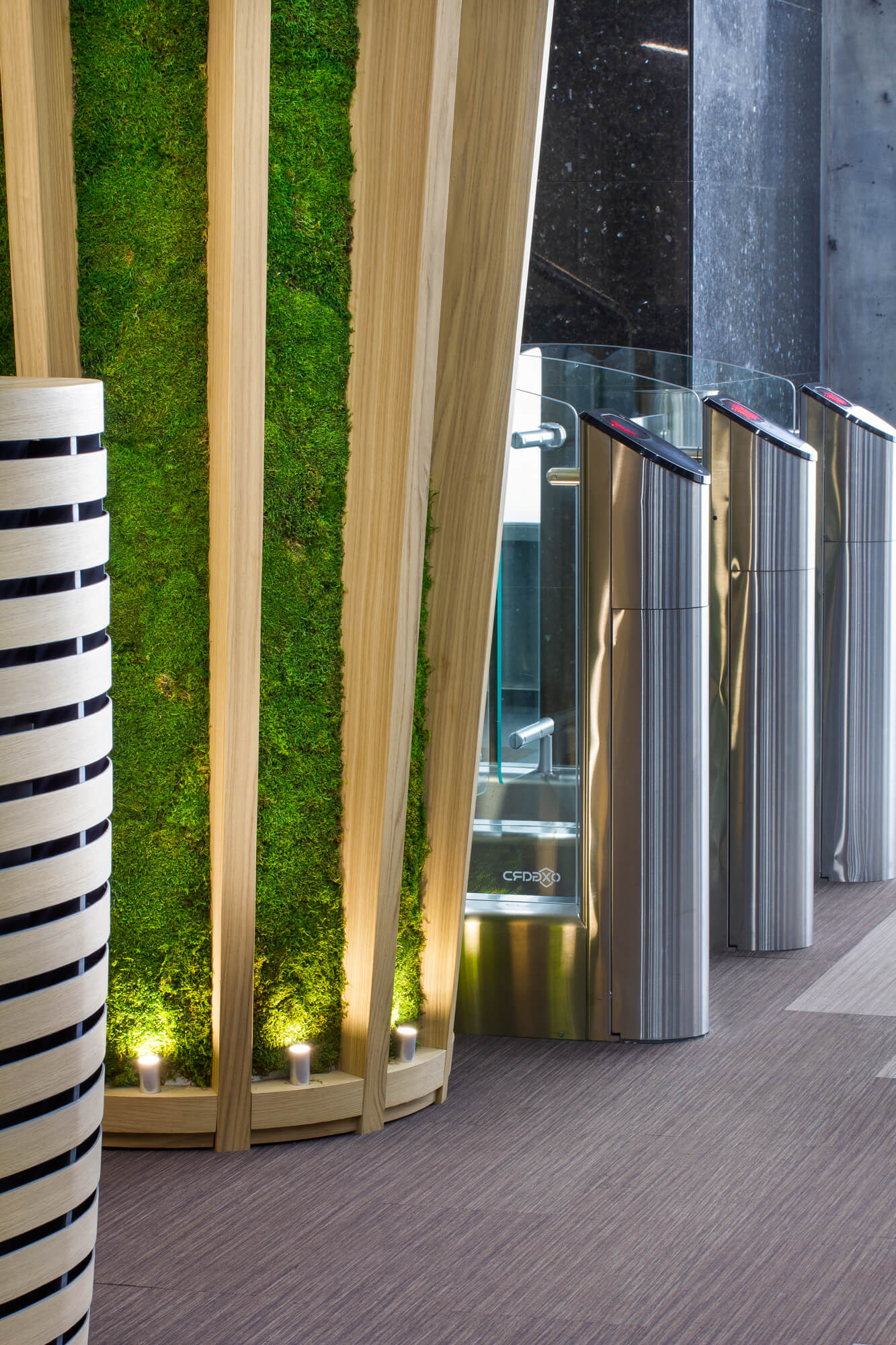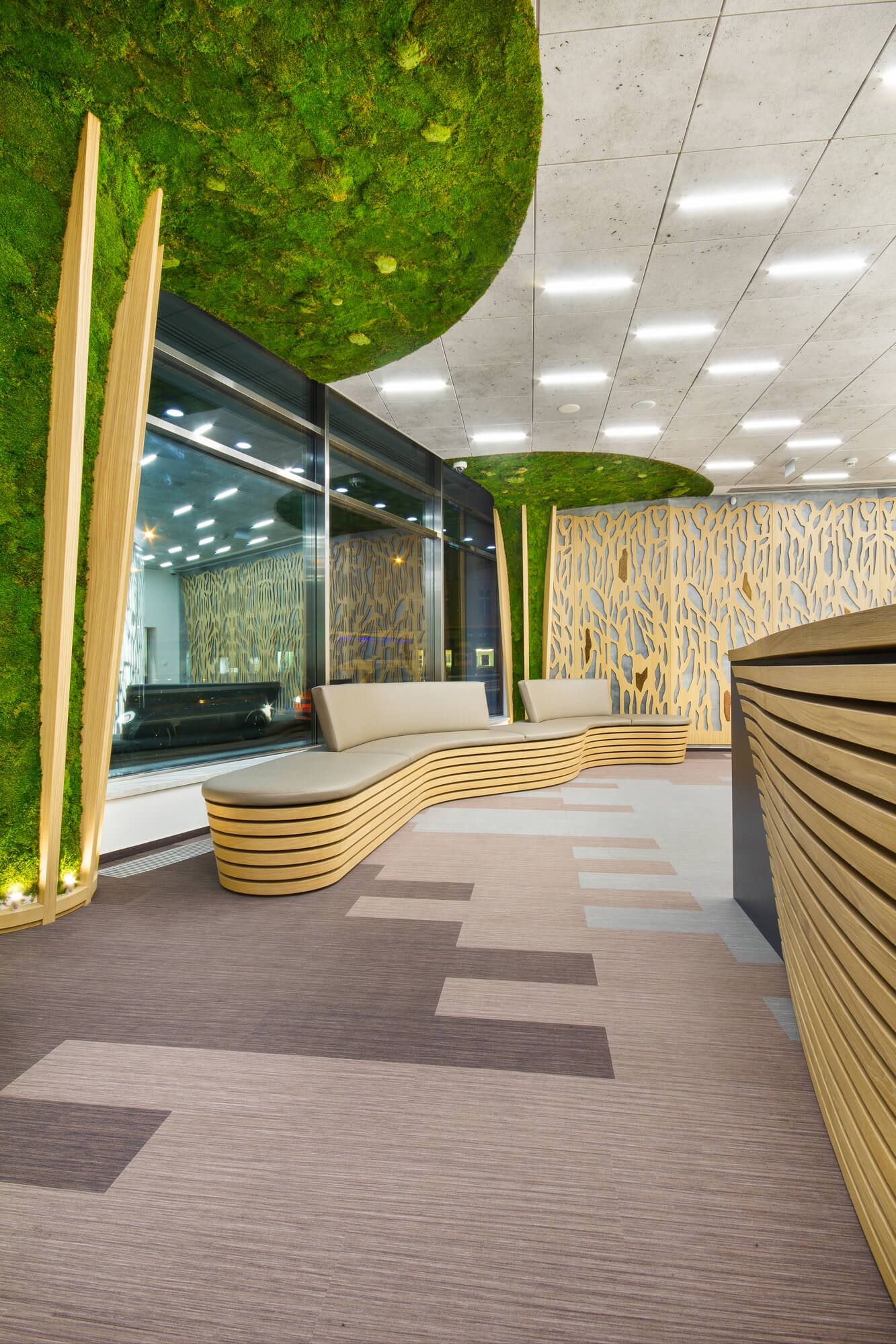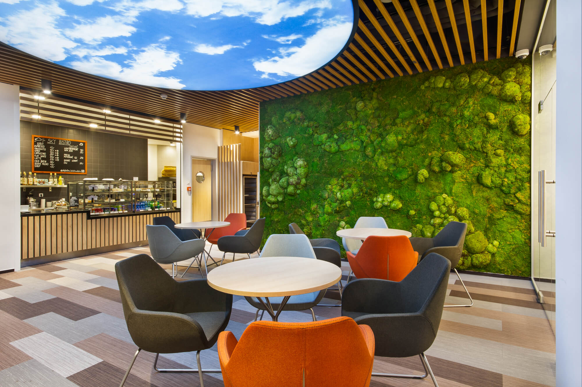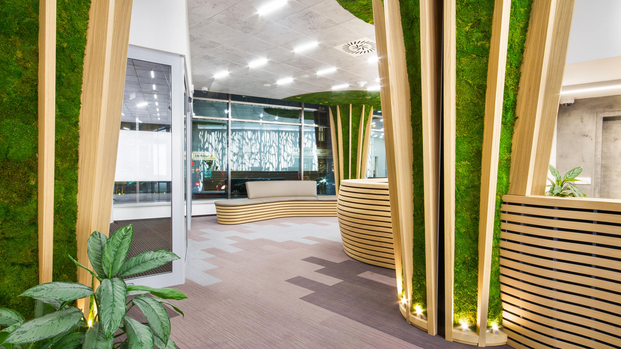 V novém sídle mediální skupiny Media Bohemia jsme realizovali mechové stěny a stropní mechové prvky, které se staly nedílnou součástí architektonického konceptu interiéru. Mechy byly aplikovány nejen na stěnách, ale i na sloupech a stropních plochách, kde vytvářejí výrazný vizuální prvek a zároveň podporují klidnou a vyváženou atmosféru pracovního prostředí. Cílem investora bylo vytvořit interiér, ve kterém se zaměstnanci i návštěvníci budou cítit příjemně – a živý mech zde sehrává klíčovou roli v propojení designu, akustického komfortu a psychické pohody.