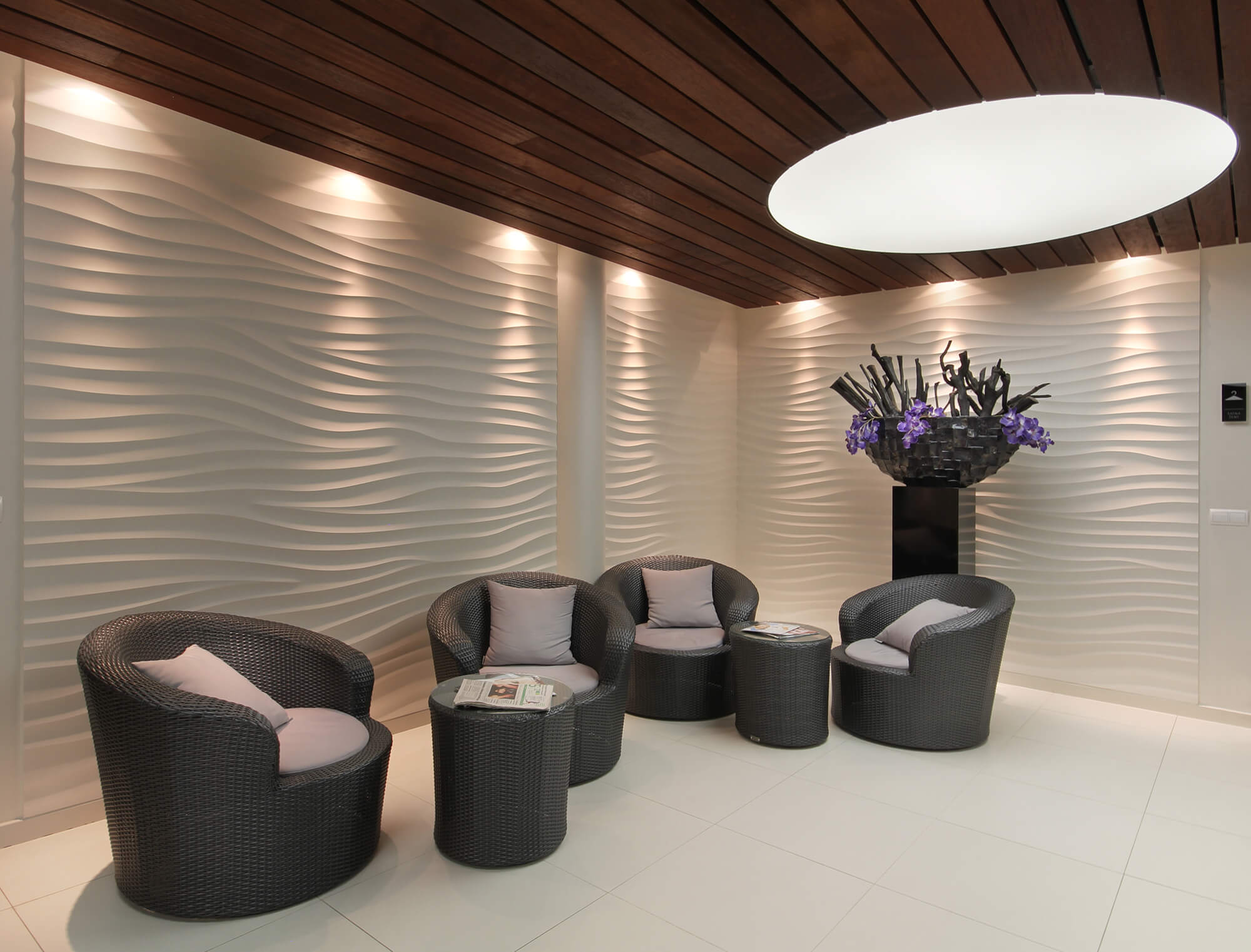 V Centru pohybové medicíny Pavla Koláře se vzájemně doplňuje několik povrchů originální Sculpural, minimalistická Imitace betonu, dřevo a benátský štuk.