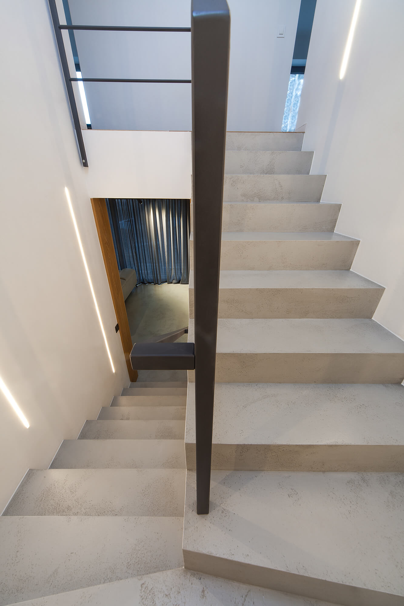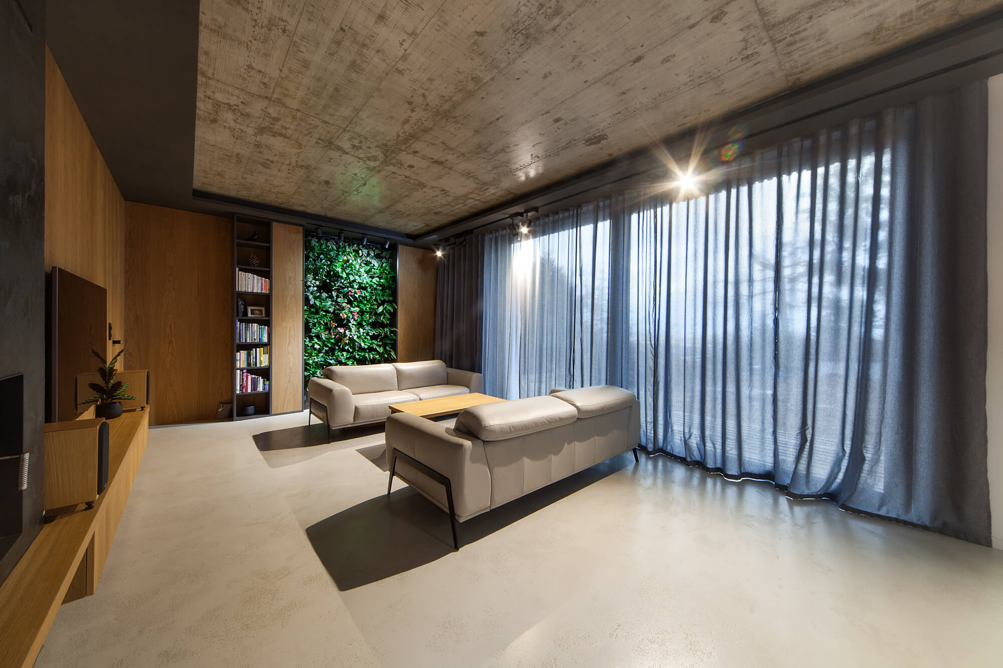 Rodinný dům Černolice je ukázkou promyšleného propojení funkčních povrchů a živého prvku interiéru. Betonepox® byl použit na podlahách, schodišti i v koupelně, kde vyniká svou odolností a praktičností v každodenním provozu. Obývací prostor jsme doplnili o vertikální zahradu Cascade Garden®, která do interiéru přináší zeleň, klid a přirozený kontrast k surovějším povrchům.