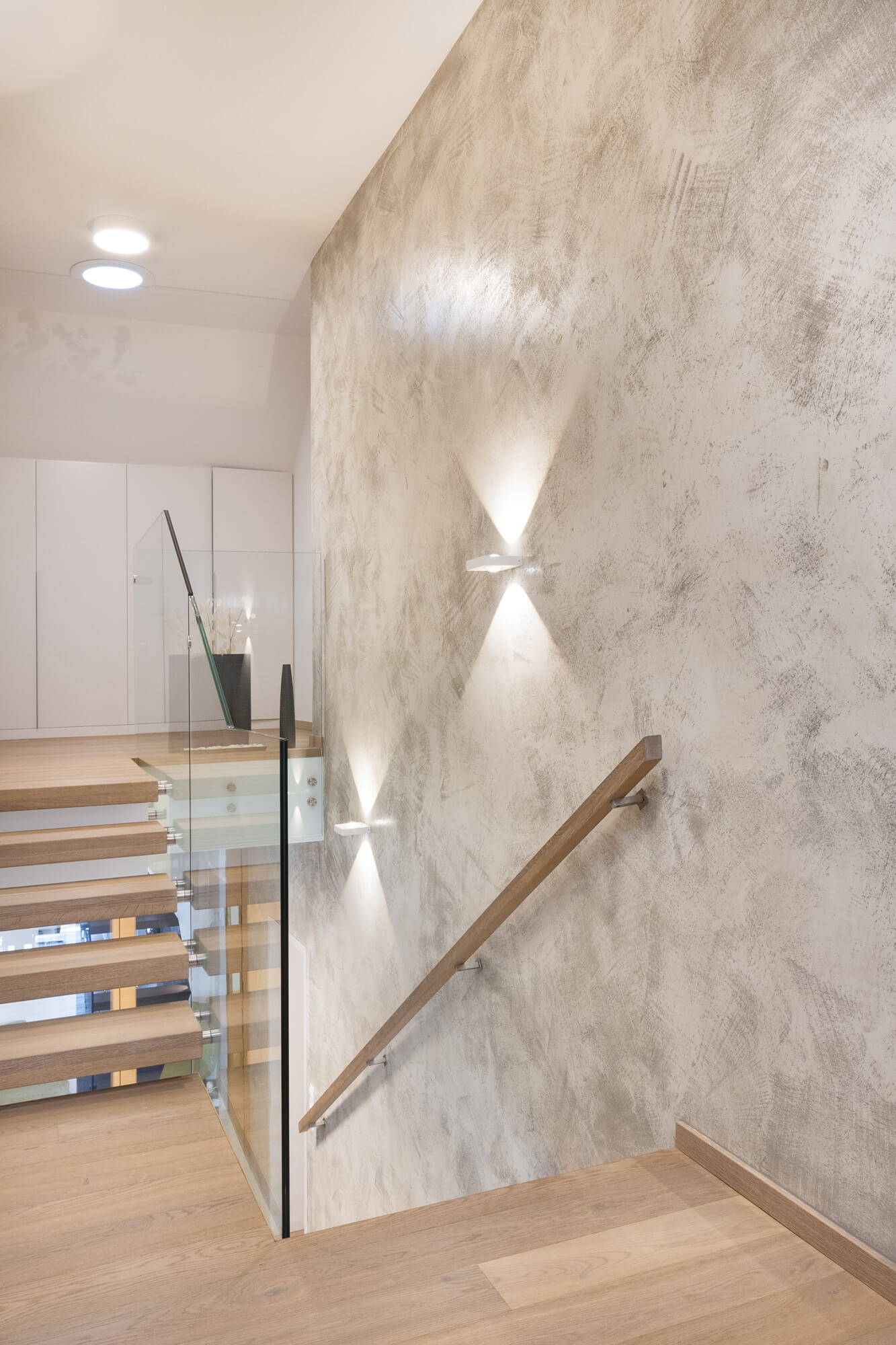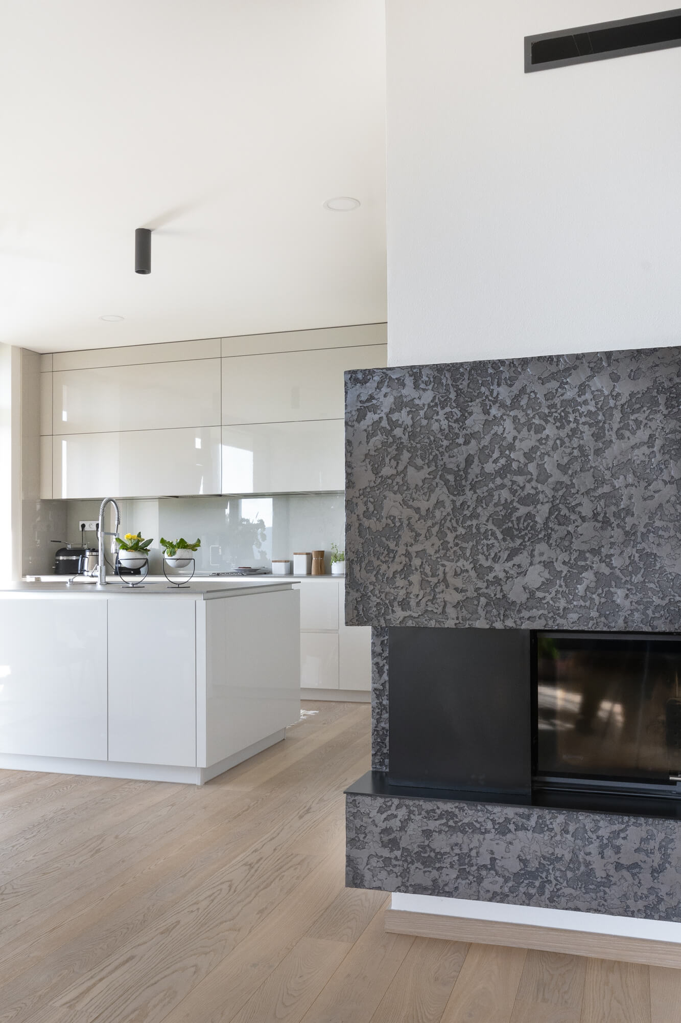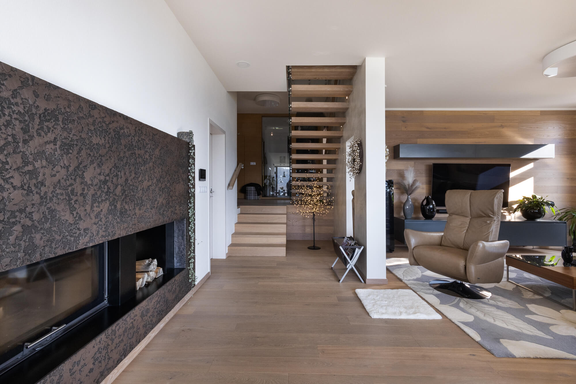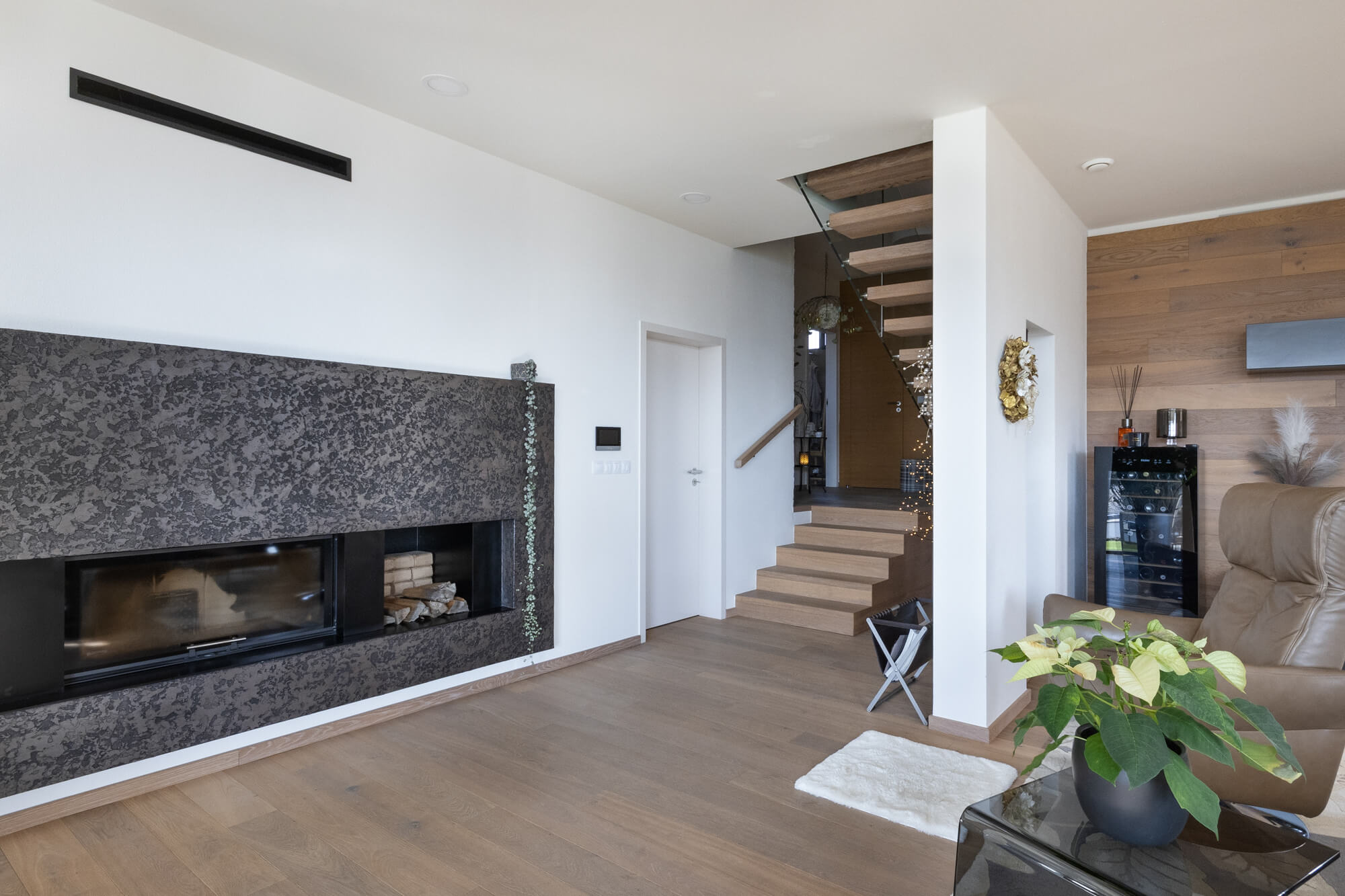 Majitelé tohoto domu si splnili sen o krásném prosvětleném jídelním koutu. Jeho příjemnou atmosféru doplnila stěrka Imitace betonu® s grafikou. V obývacím pokoji se pak dominantou stal krb ve stěrce Granite, který na první pohled zaujme každého, kdo do místnosti vstoupí.