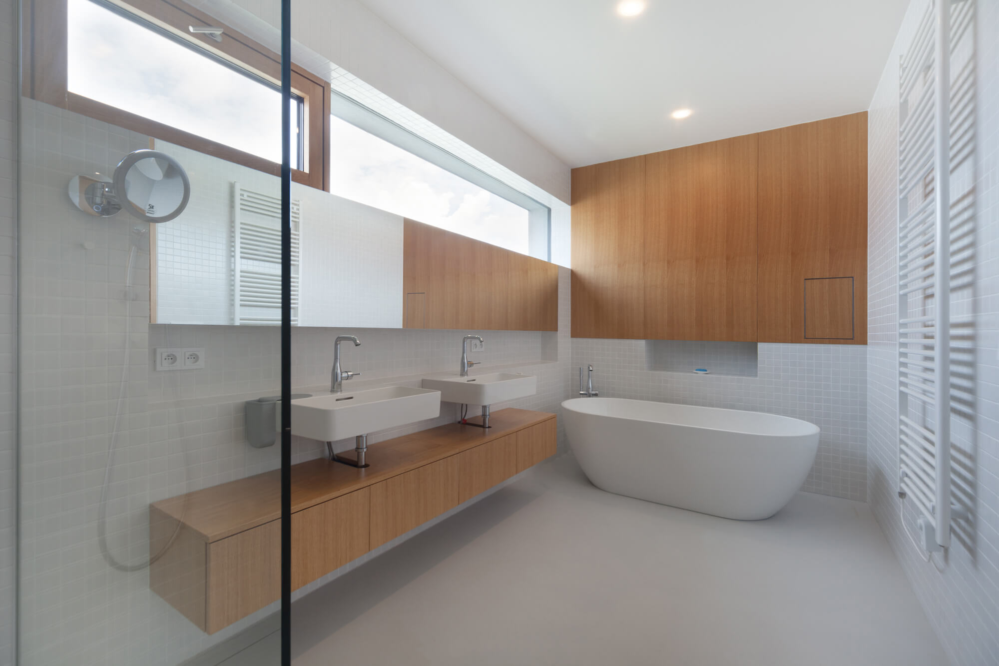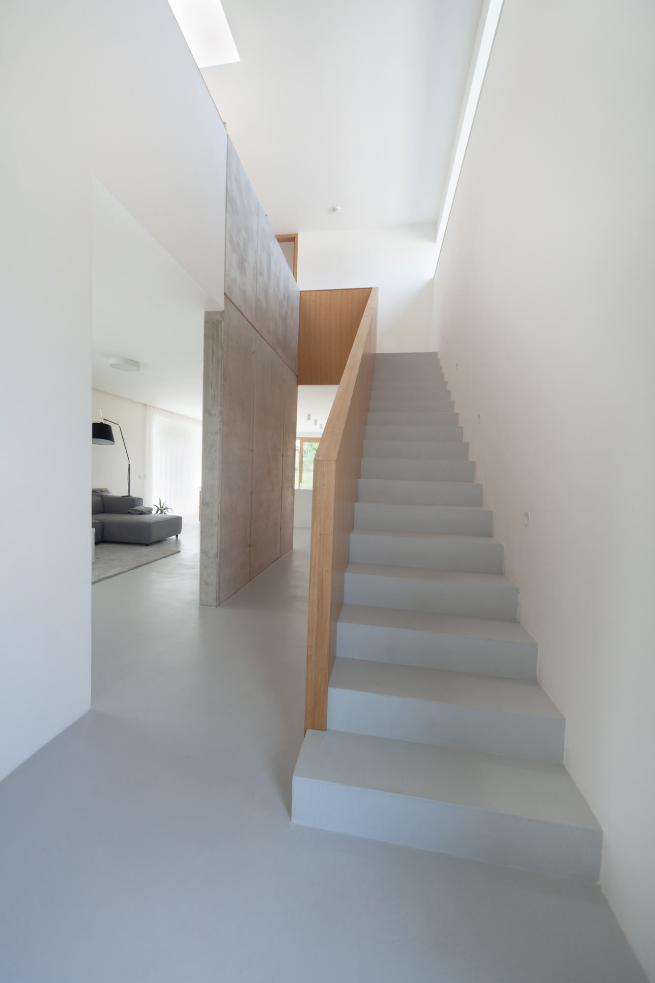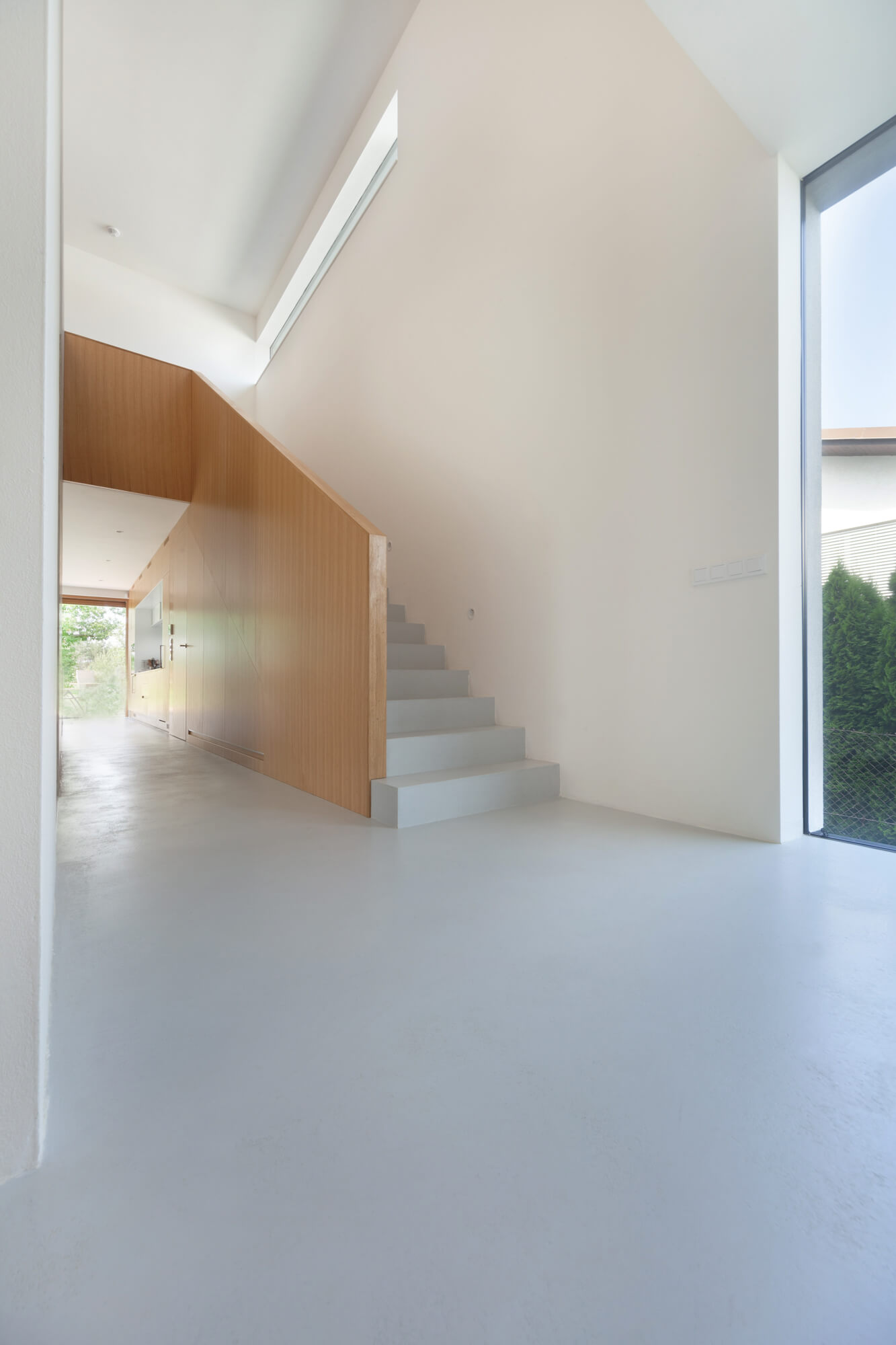 Výjimečně krásný rodinný dům, kde se snoubí minimalismus s jistým nádechem romantiky. Zajímavý pohled na jednolitý povrch tvořený stěrkou Betonepox®, který se prolíná obytným prostorem, schodištěm i velkorysou koupelnou a ložnicí.