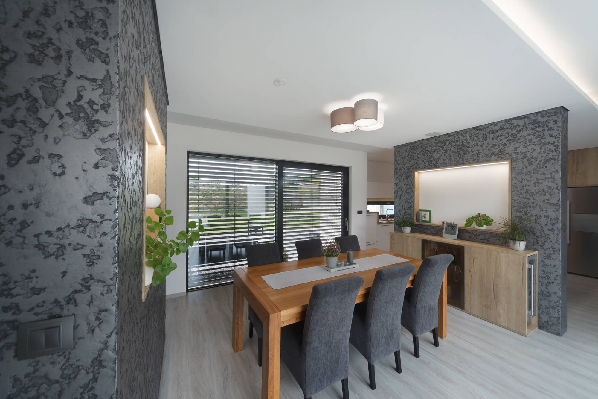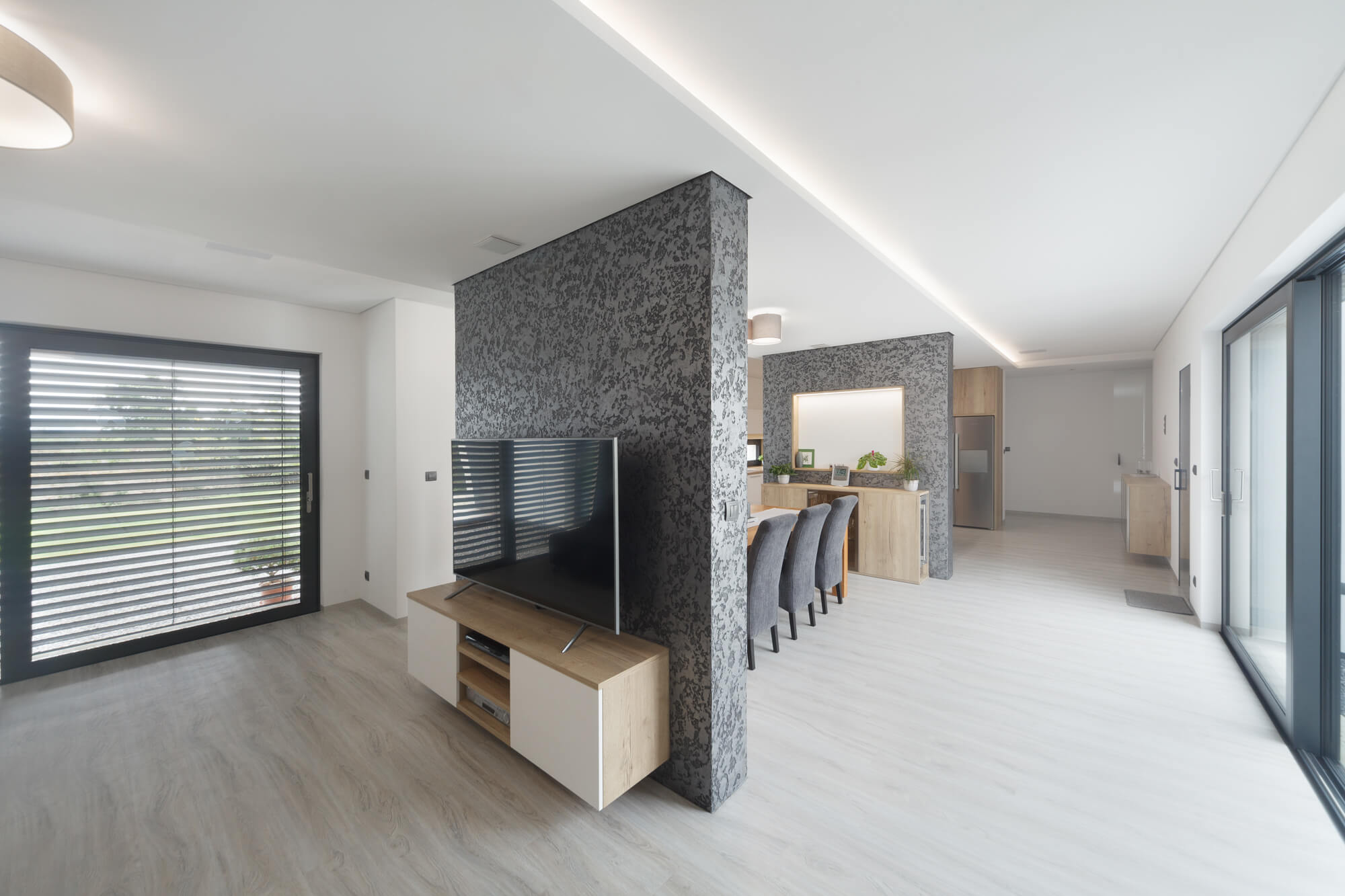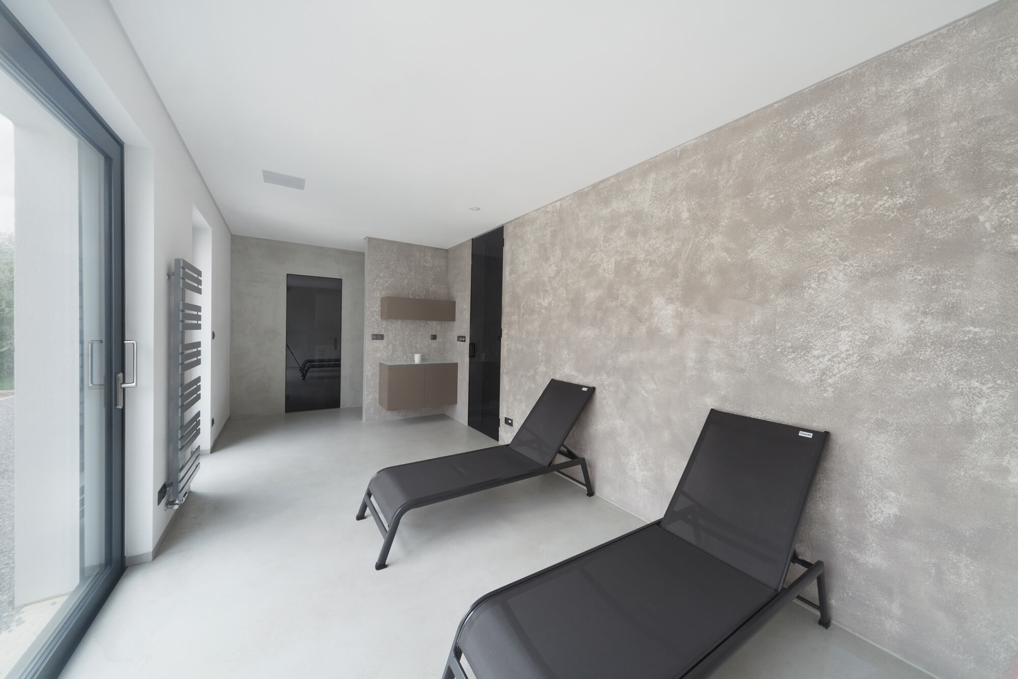 V obývacím pokoji jsme realizovali dekorativní stěrku Granite, která díky výrazné plastické struktuře vytváří silný vizuální dojem a stává se dominantním prvkem interiéru. Součástí projektu byla také betonová stěrka Betonepox® v koupelnách, zvolená pro svou vysokou odolnost, snadnou údržbu a moderní, čistý vzhled. V relaxační zóně byla aplikována stěrka Pitted, jejíž jemná struktura podtrhuje klidnou a uvolněnou atmosféru prostoru.