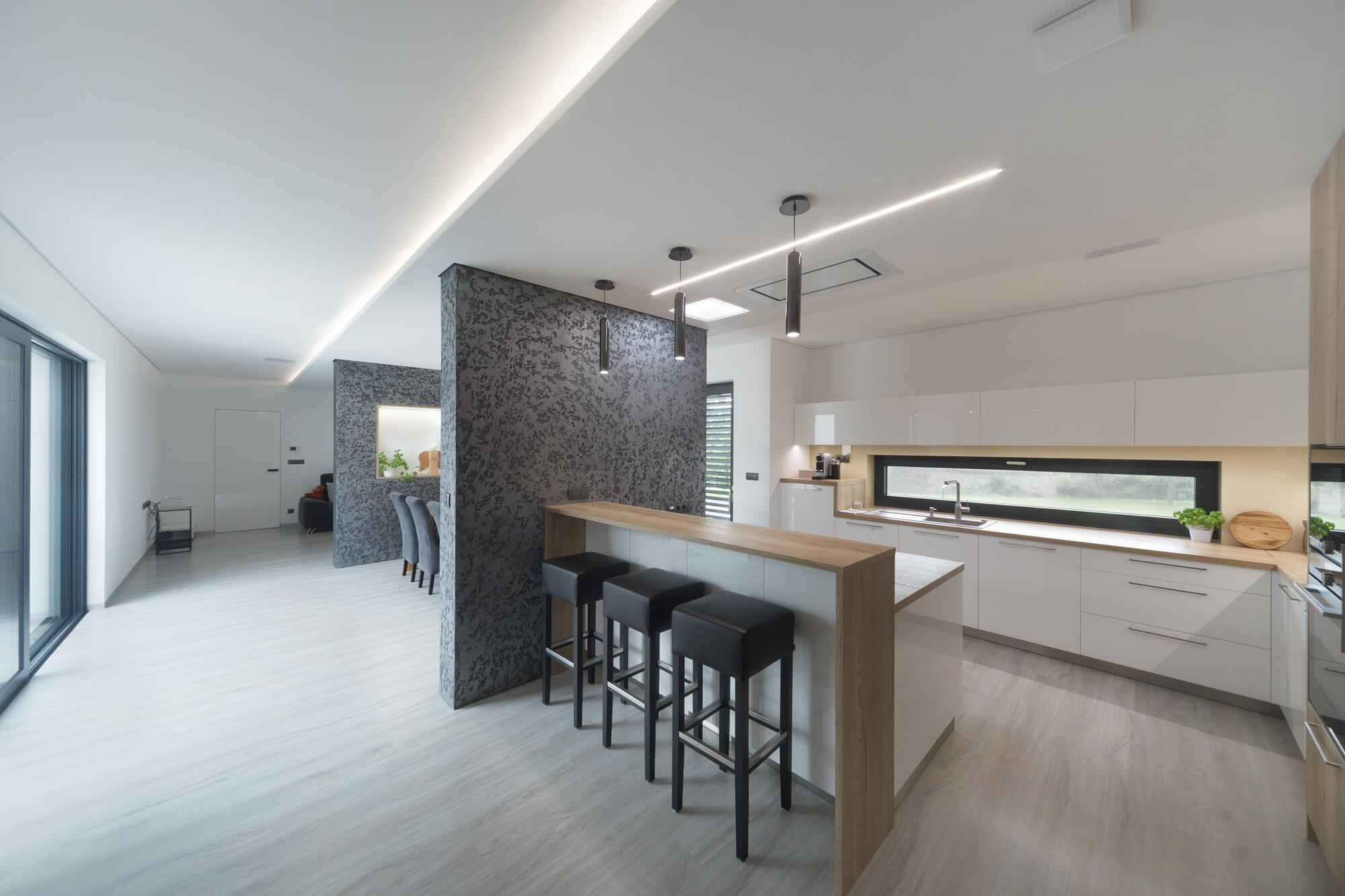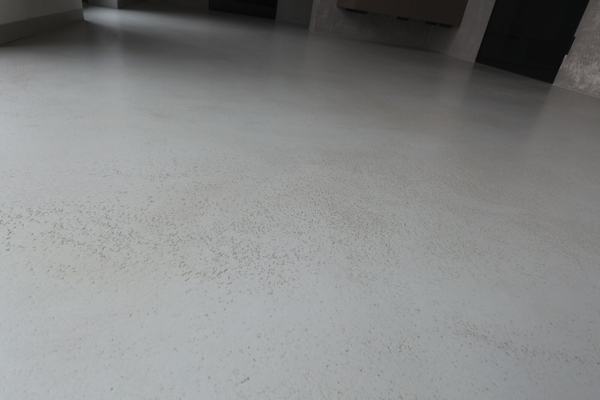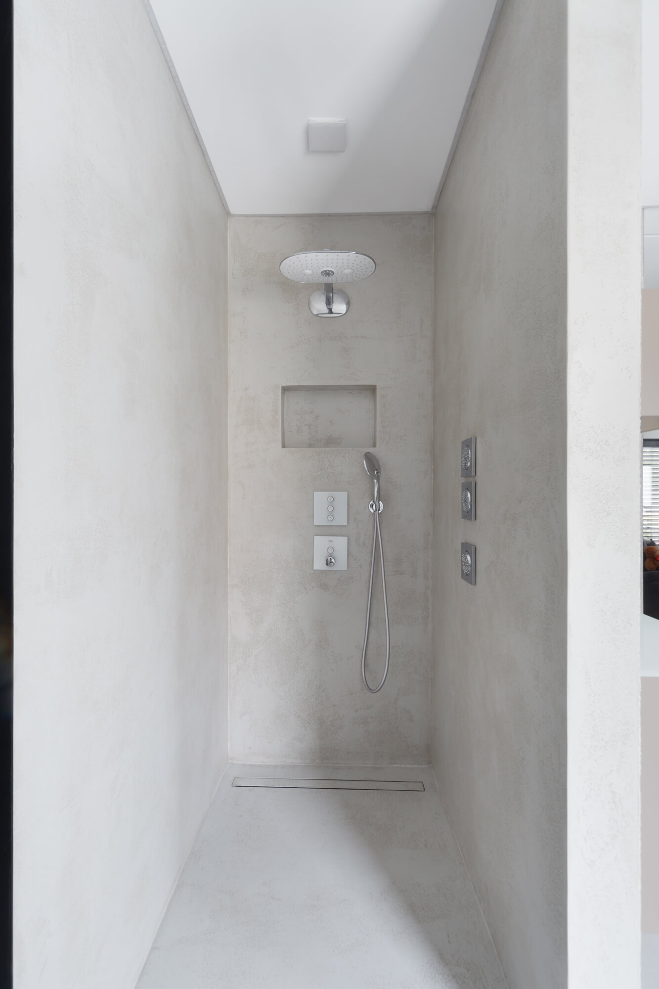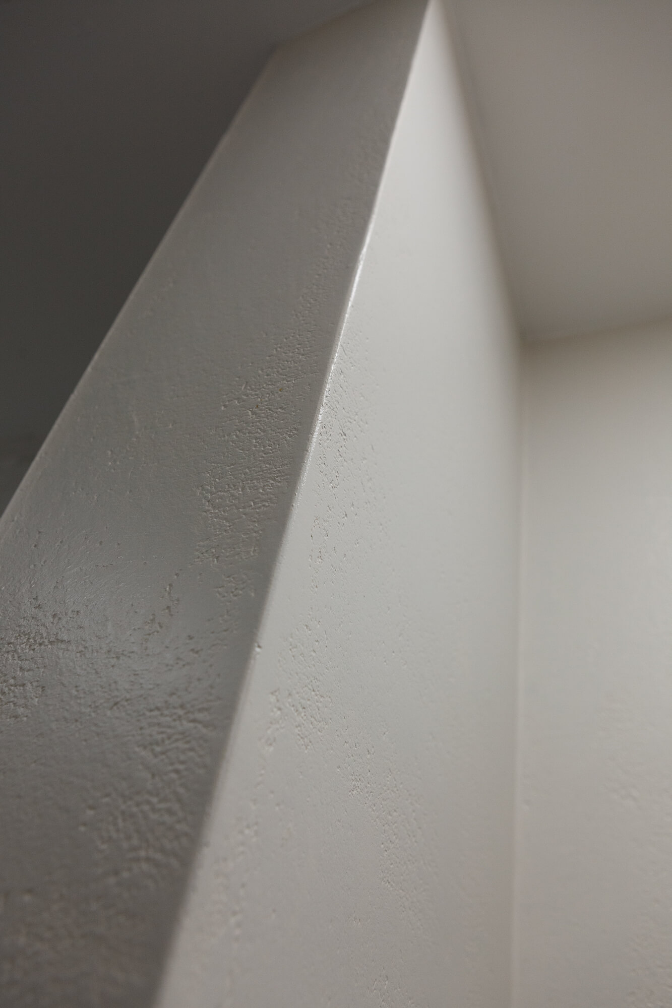 V obývacím pokoji jsme realizovali dekorativní stěrku Granite, která díky výrazné plastické struktuře vytváří silný vizuální dojem a stává se dominantním prvkem interiéru. Součástí projektu byla také betonová stěrka Betonepox® v koupelnách, zvolená pro svou vysokou odolnost, snadnou údržbu a moderní, čistý vzhled. V relaxační zóně byla aplikována stěrka Pitted, jejíž jemná struktura podtrhuje klidnou a uvolněnou atmosféru prostoru.