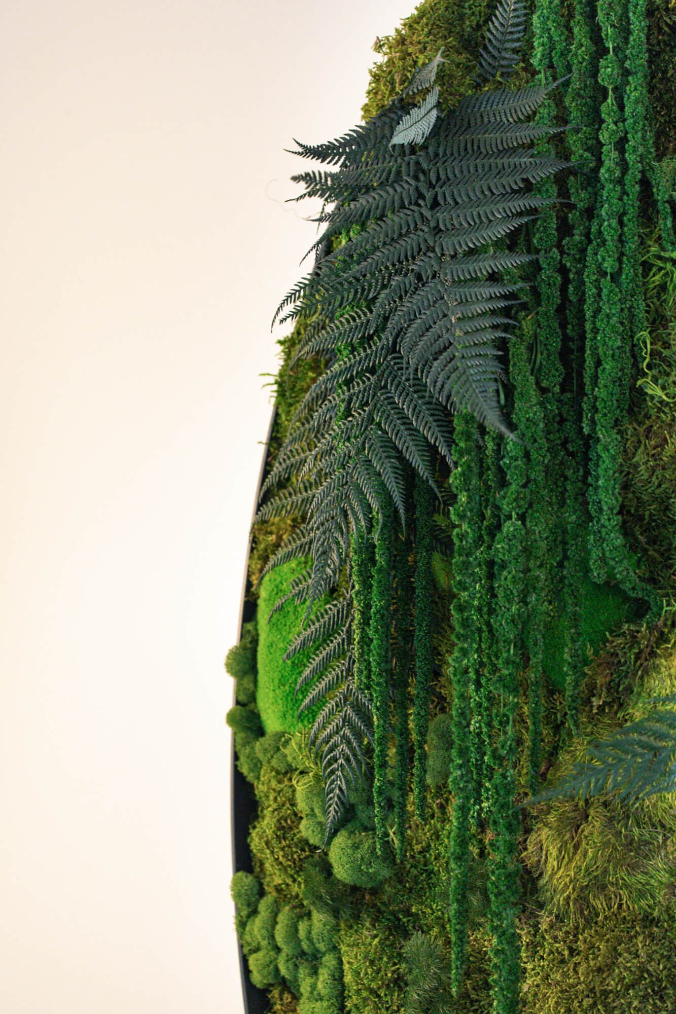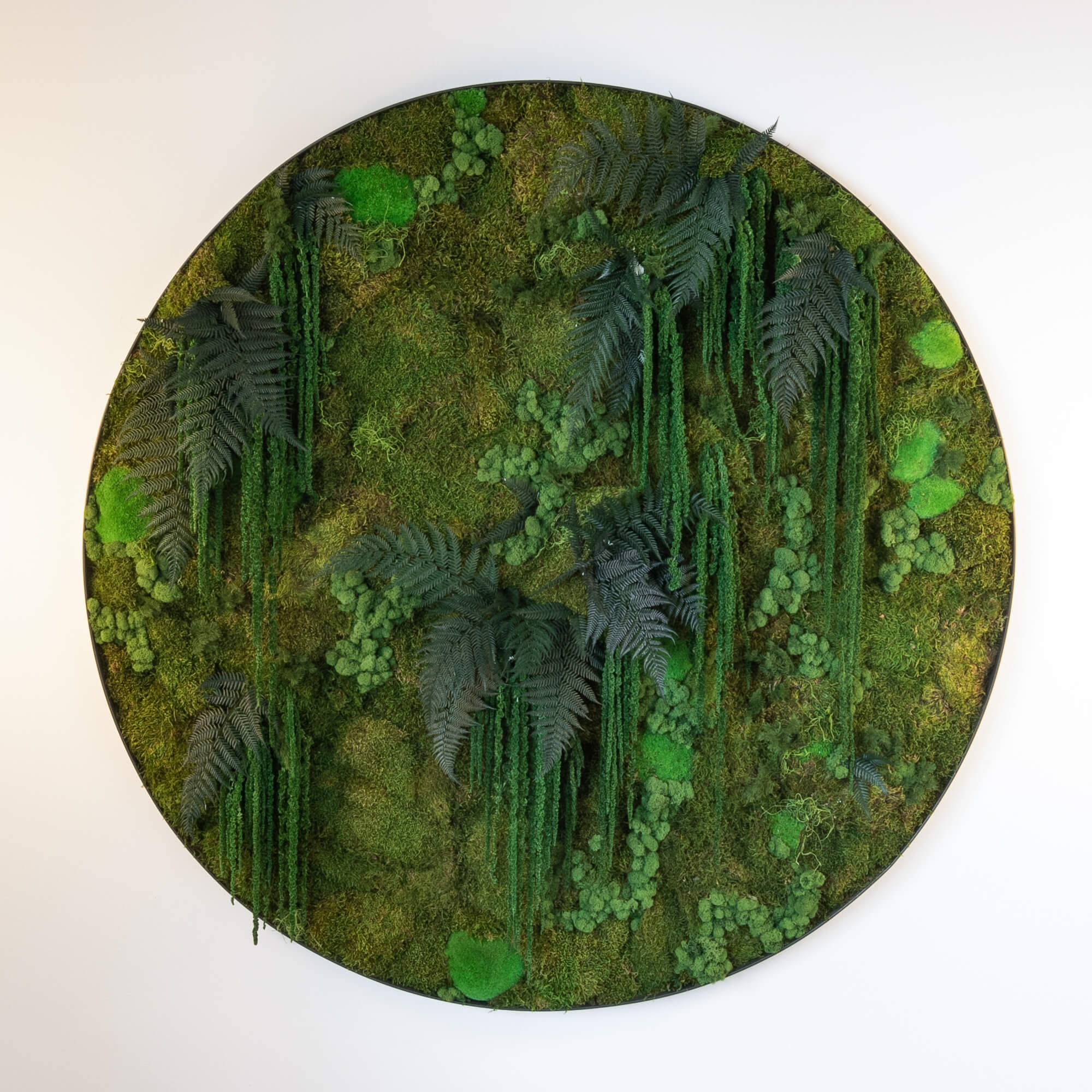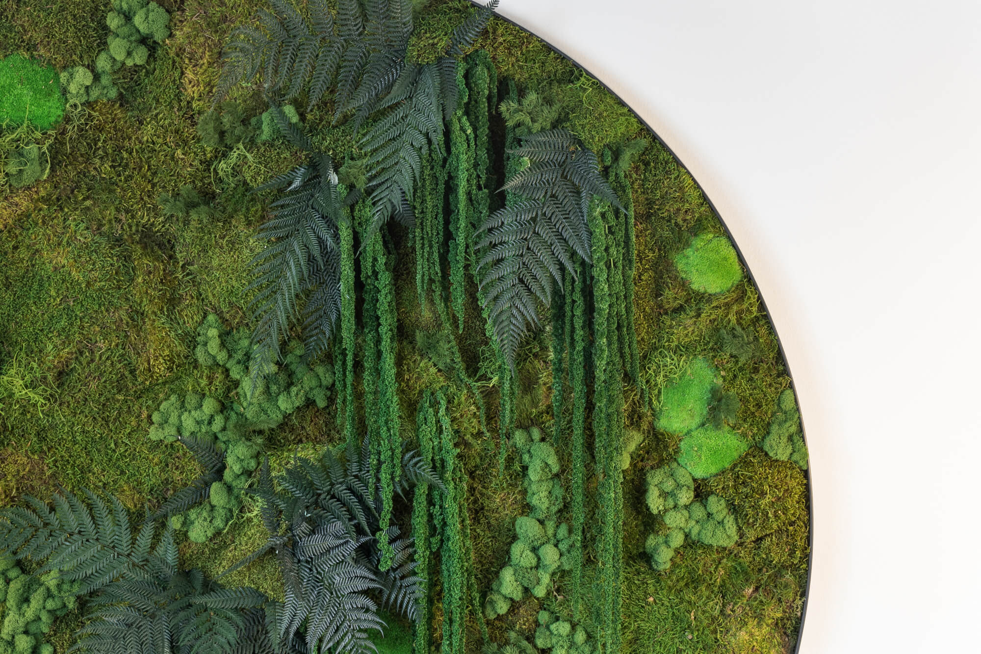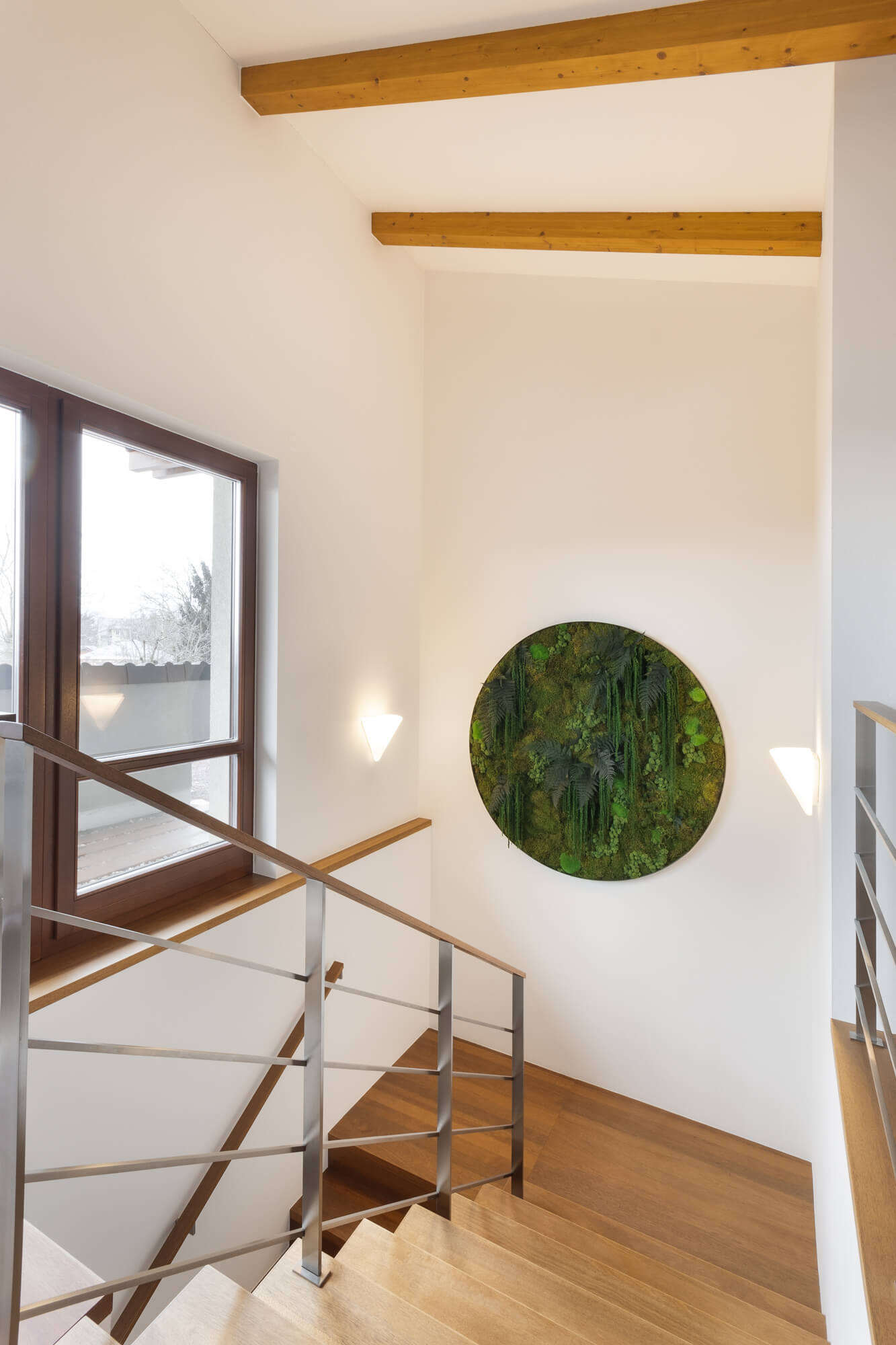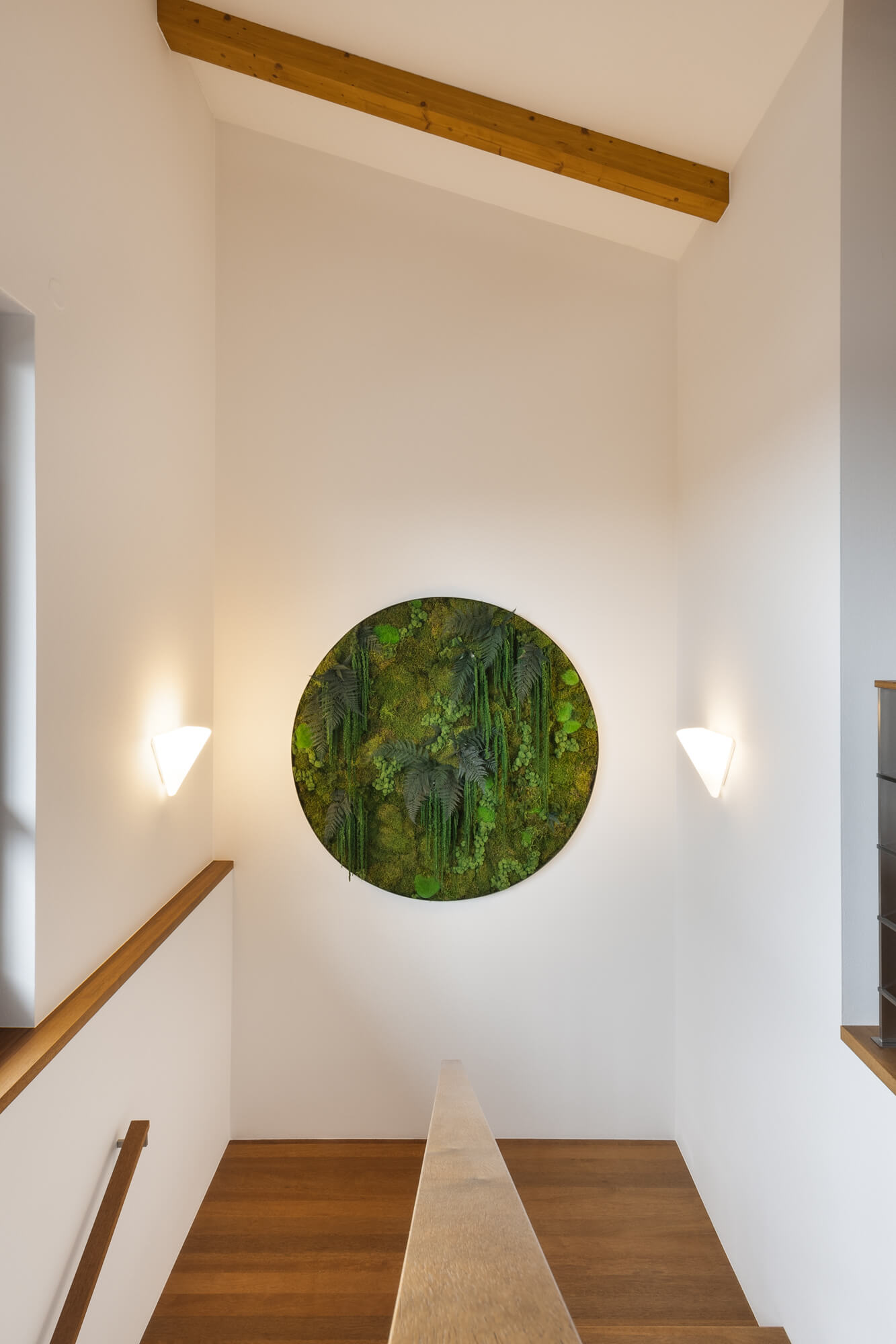 Mechový obraz umístěný nad schodištěm v rodinném domě v Kolovratech vnáší do interiéru přirozený prvek a jemnou zeleň. Kruhový formát v kombinaci s různými druhy mechů vytváří výrazný, ale harmonický detail, který oživuje prostor schodiště a přirozeně přitahuje pozornost. Mechový obraz dodává interiéru osobitý charakter a propojuje moderní bydlení s přírodním prvkem bez nároků na údržbu.