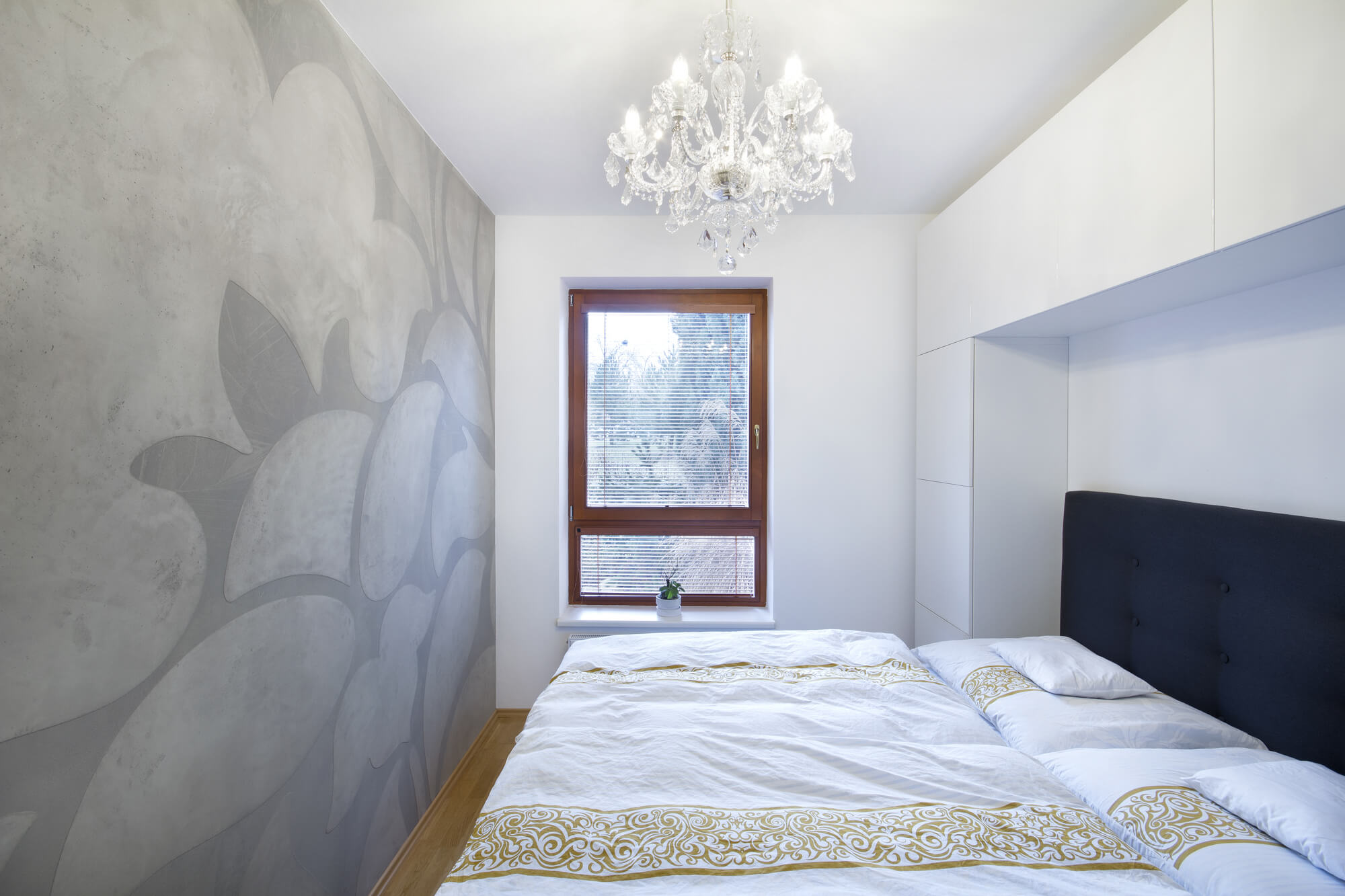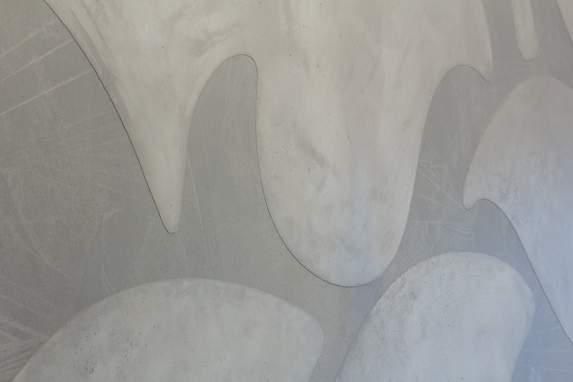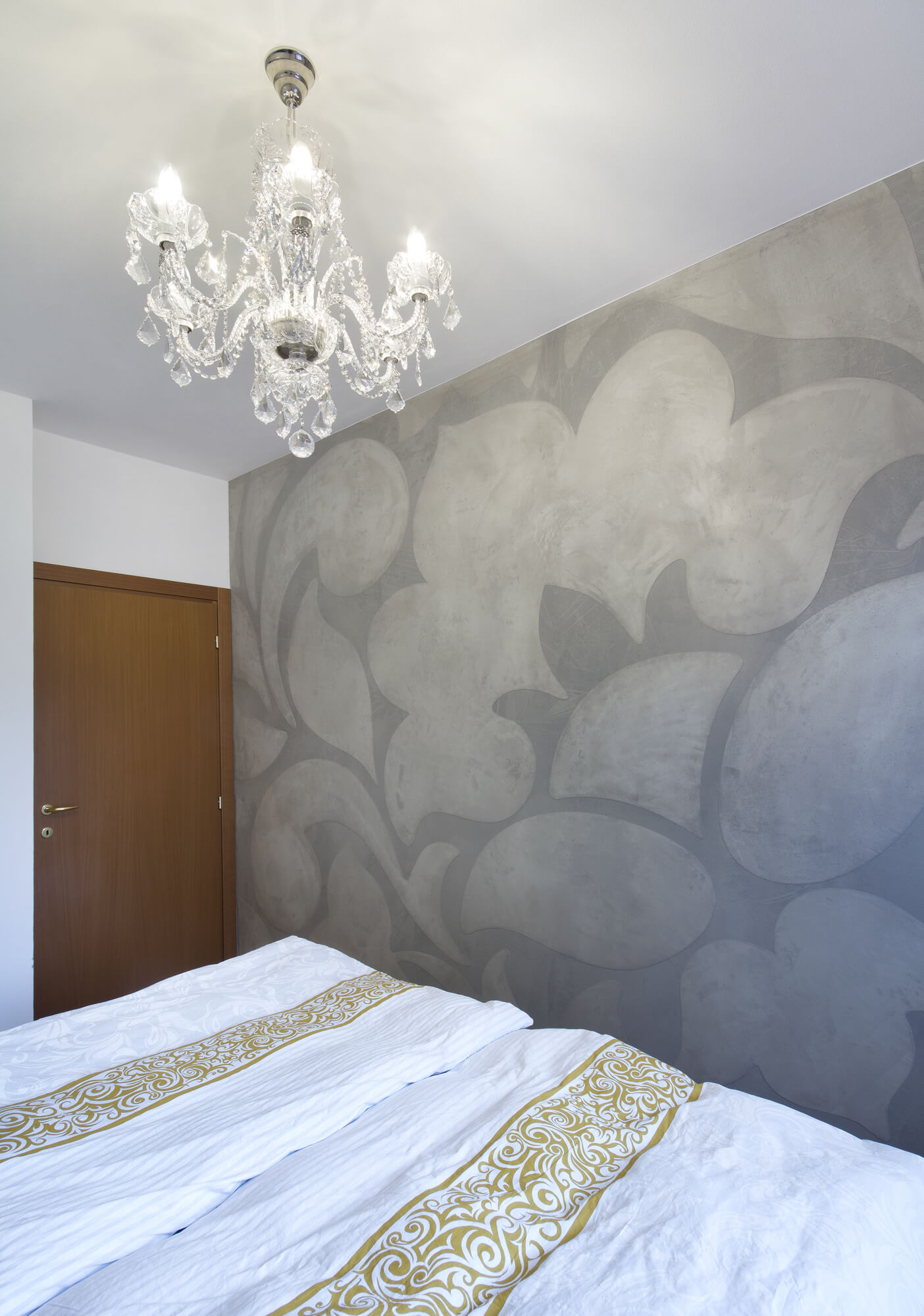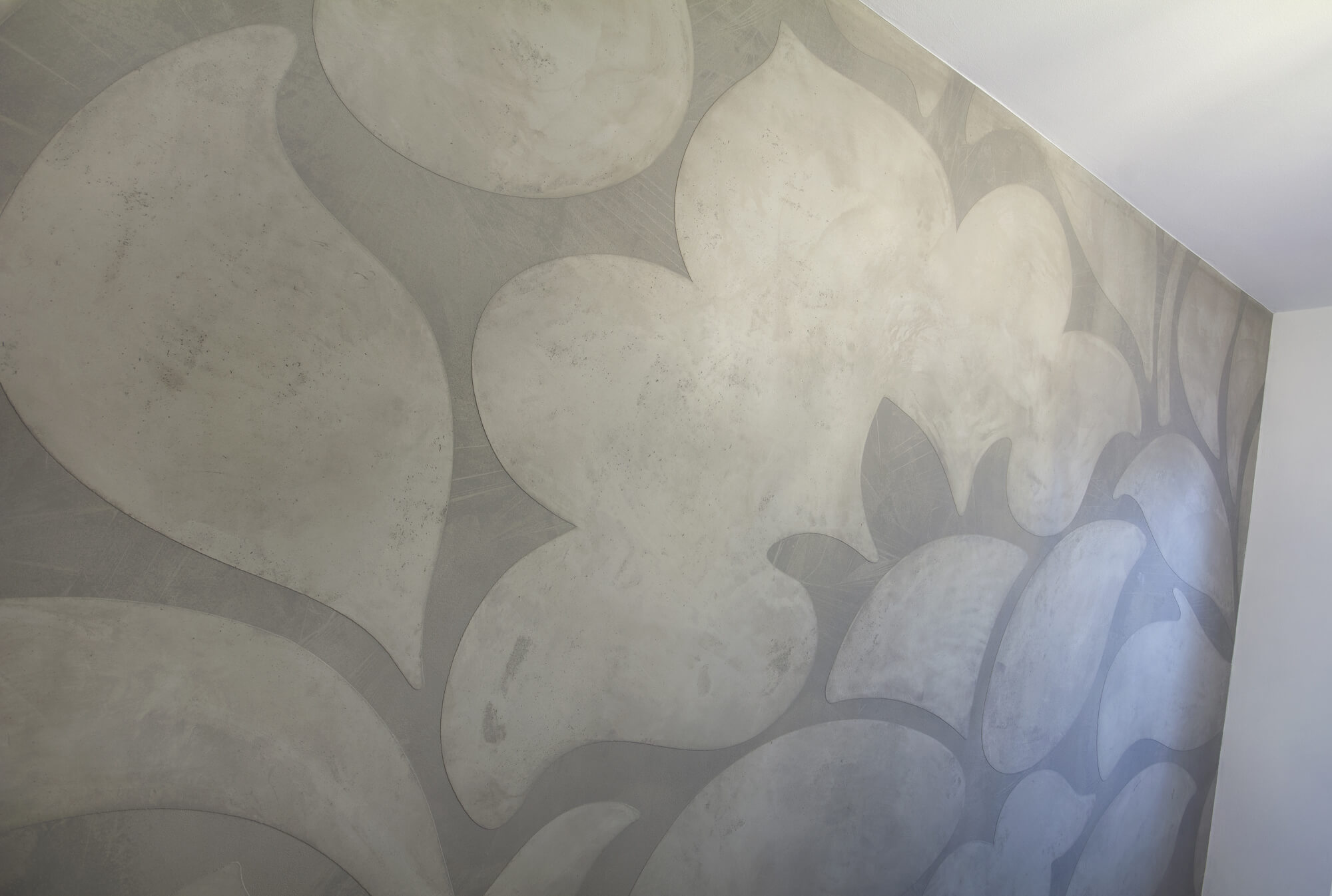 Grafika v betonové stěrce Imitace betonu® je ukázkou toho, že i stěna může fungovat jako výrazný dekorativní prvek. Na pozadí chladného betonového povrchu vytváří jemně romantickou atmosféru, která se přirozeně hodí do moderně pojaté ložnice.