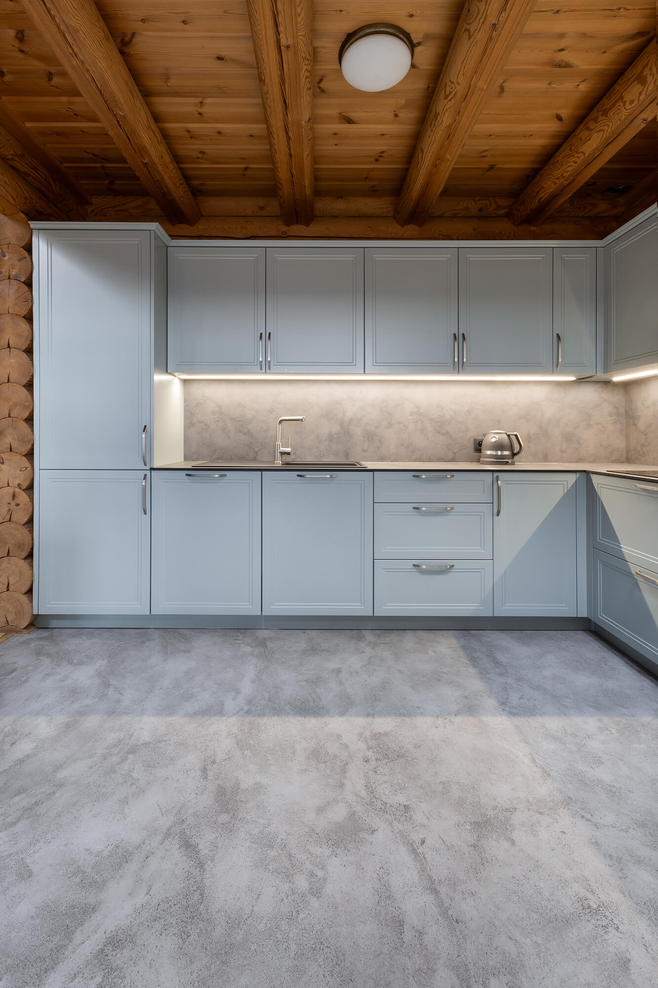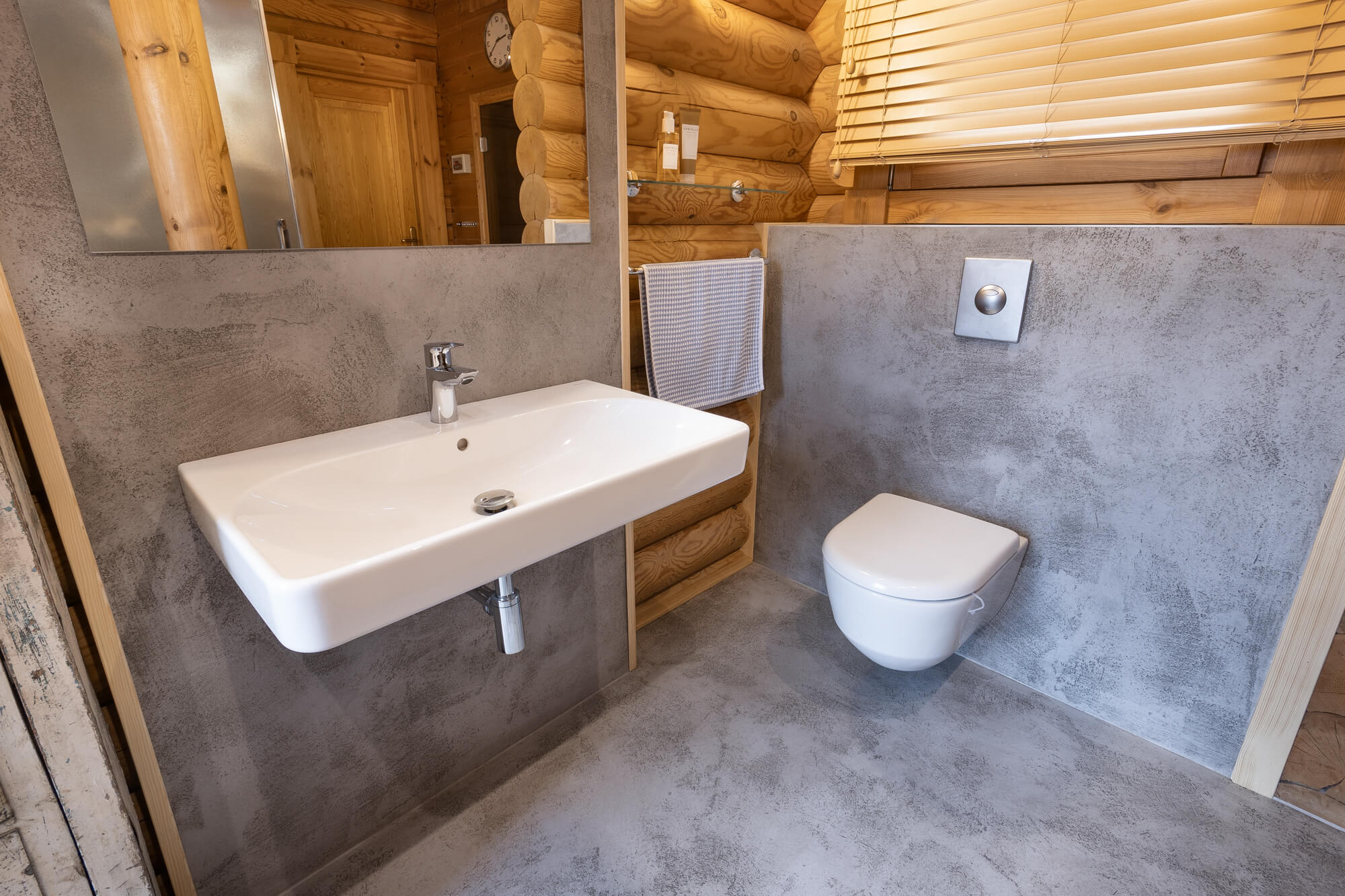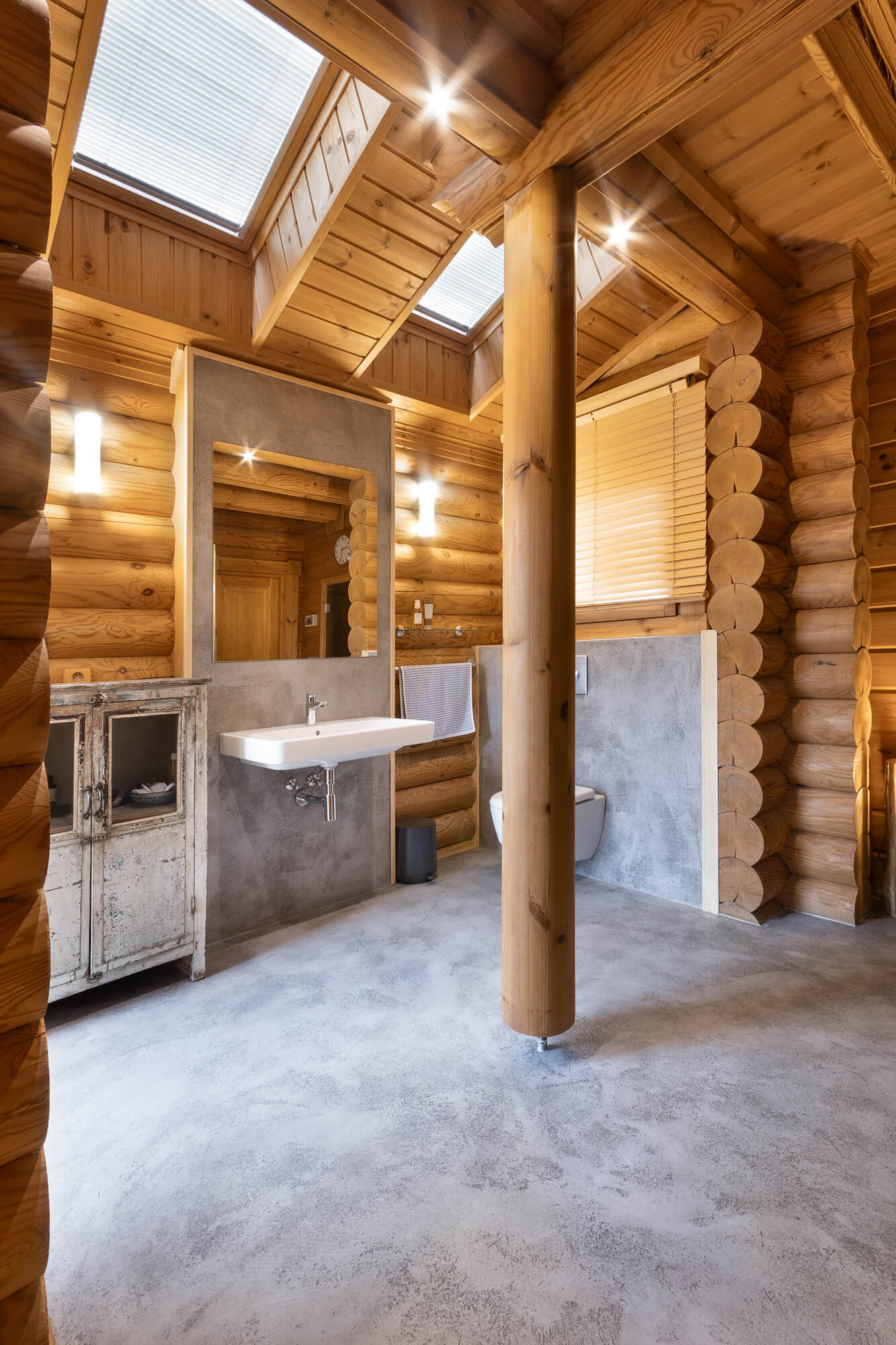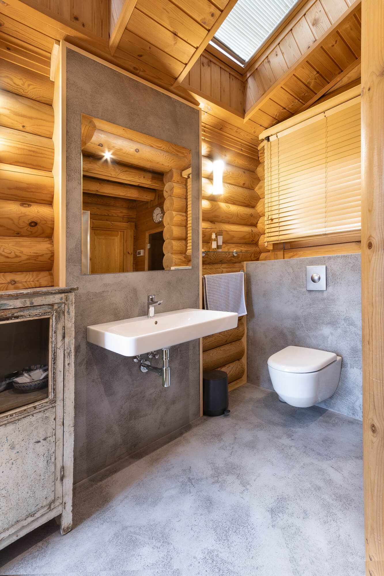 V rodinném domě ve Svatém Janu jsme realizovali betonovou stěrku Betonepox® Classic na podlahách v koupelně a kuchyni, kde přirozeně doplňuje masivní dřevo srubu a podtrhuje jeho nadčasový charakter. V koupelně byla stěrka aplikována také do sprchového koutu, kde vyniká svou voděodolností a funkčností. Výsledkem je harmonické propojení přírodních materiálů, moderního designu a praktického řešení pro každodenní život.