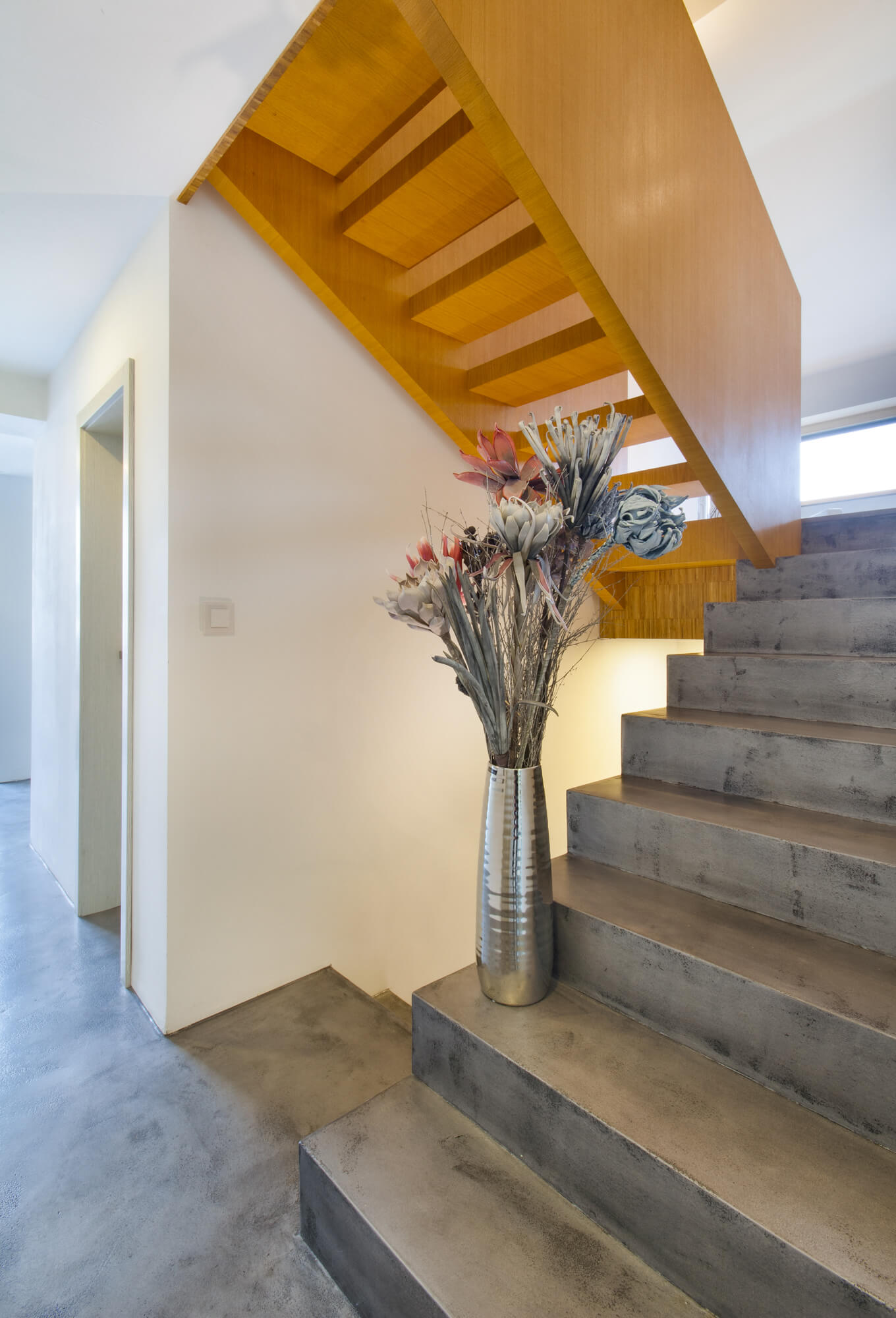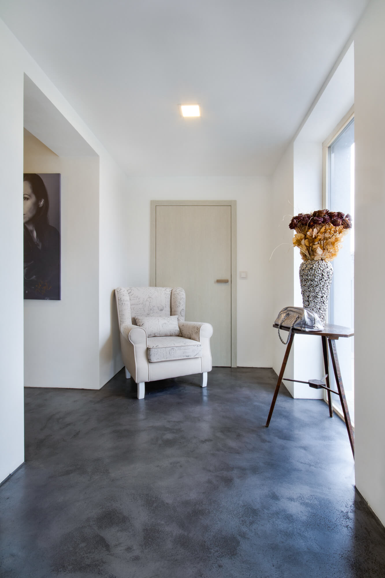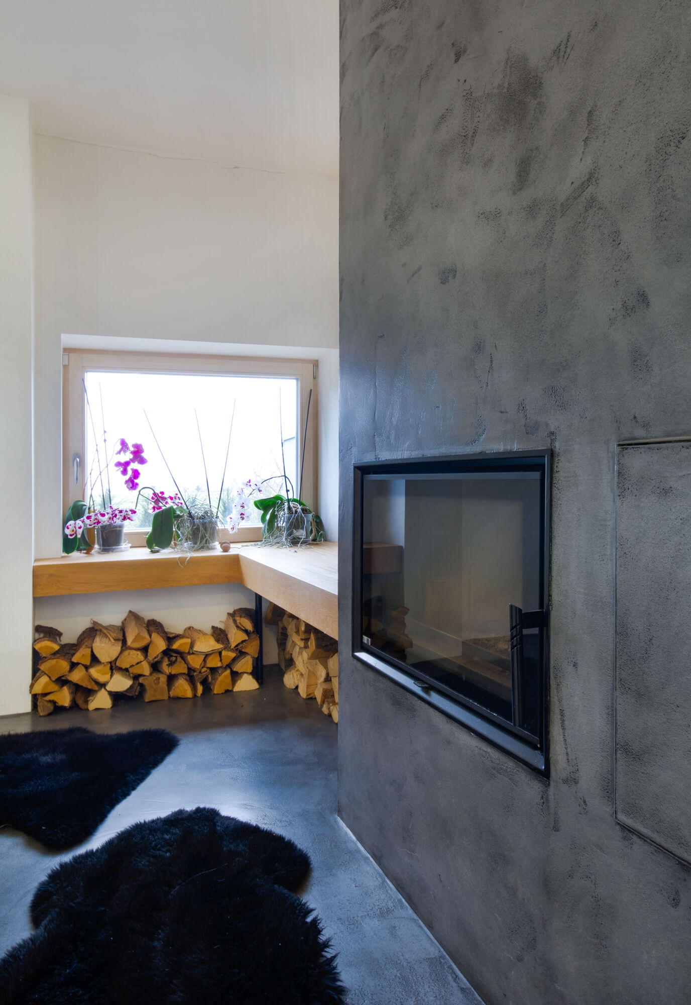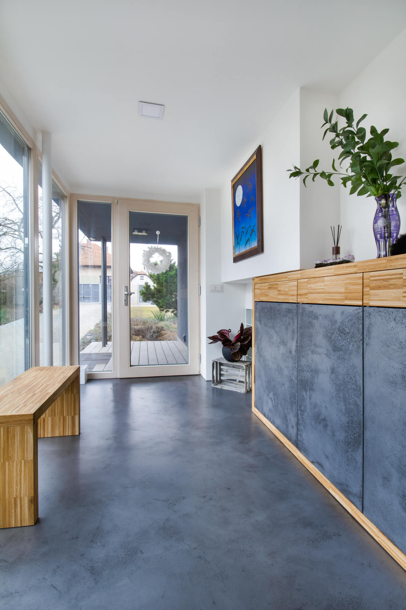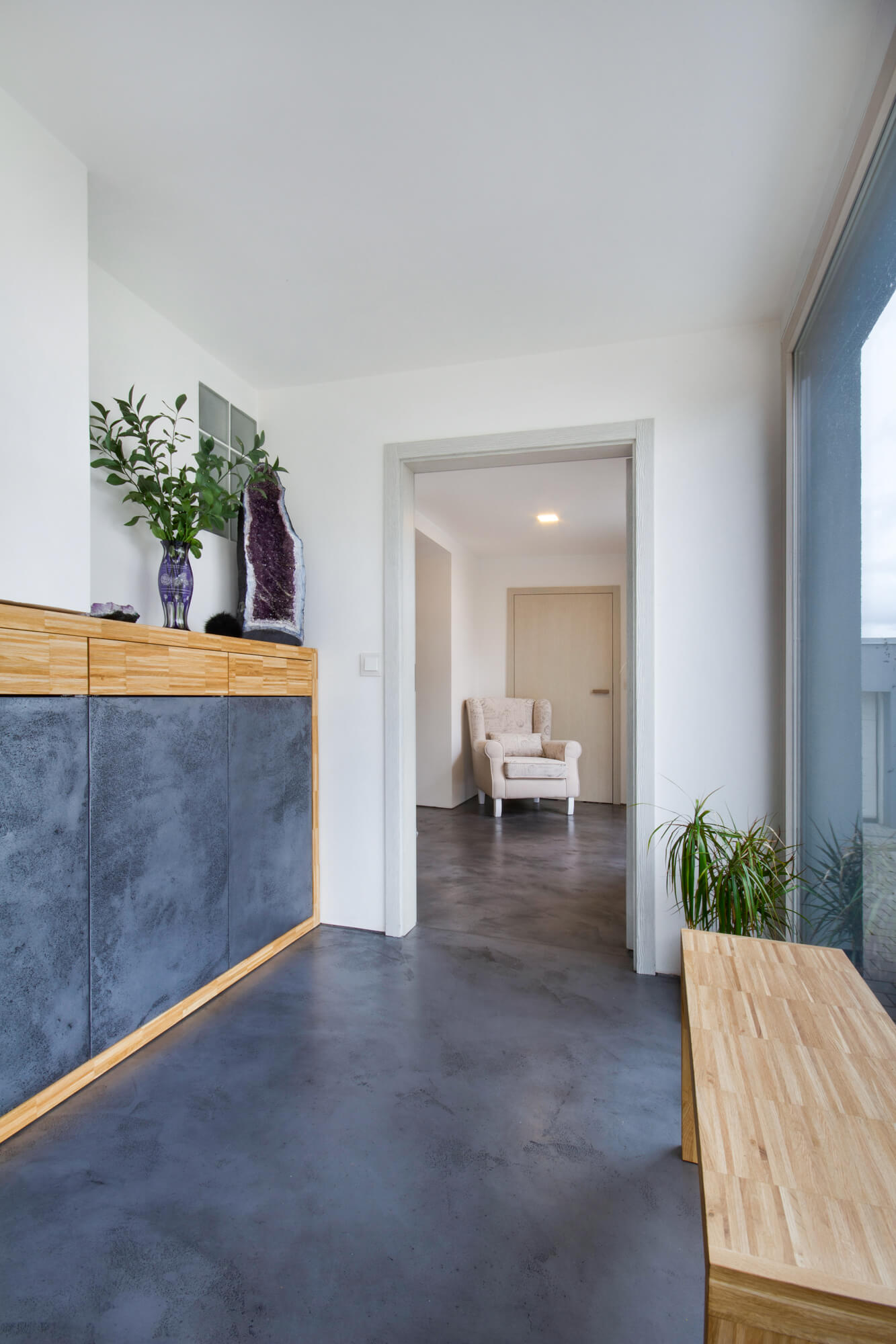 V tomto rodinném domě byla realizována betonová stěrka Betonepox®, která interiéru dodává moderní a nadčasový charakter. Povrch je přirozeně oživen jarně zelenými tóny živých rostlin, díky nimž působí prostor svěže, harmonicky a příjemně.