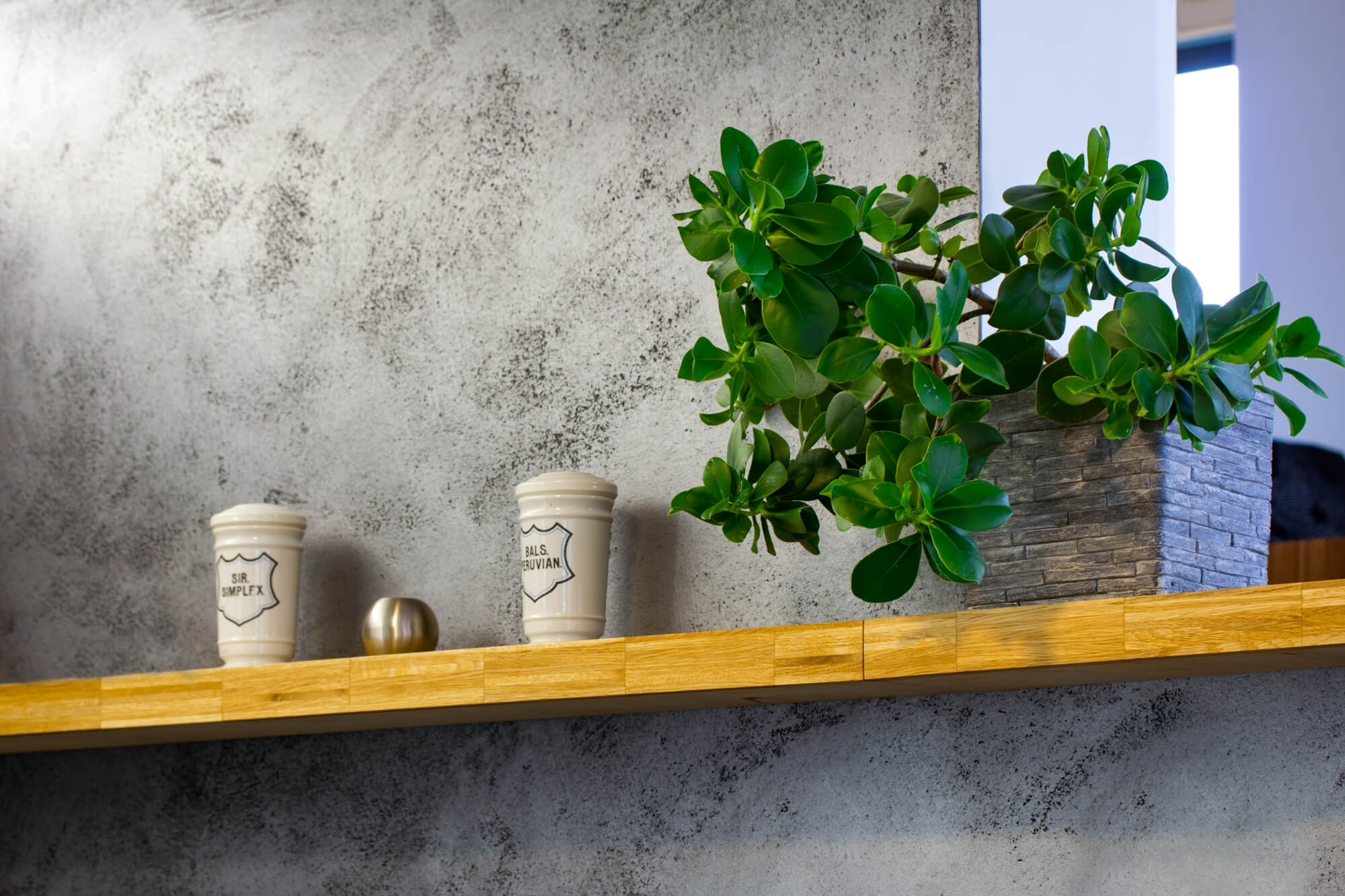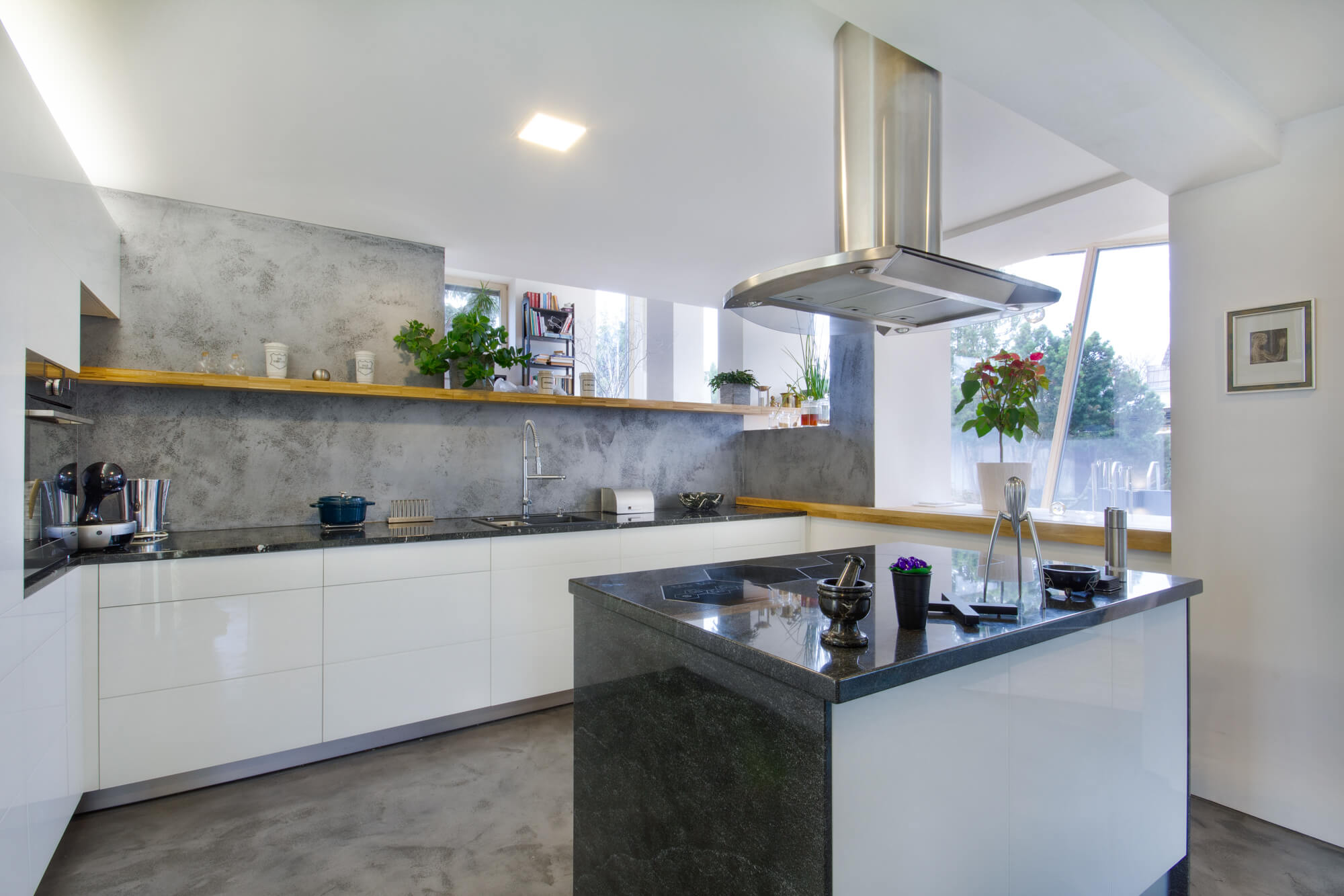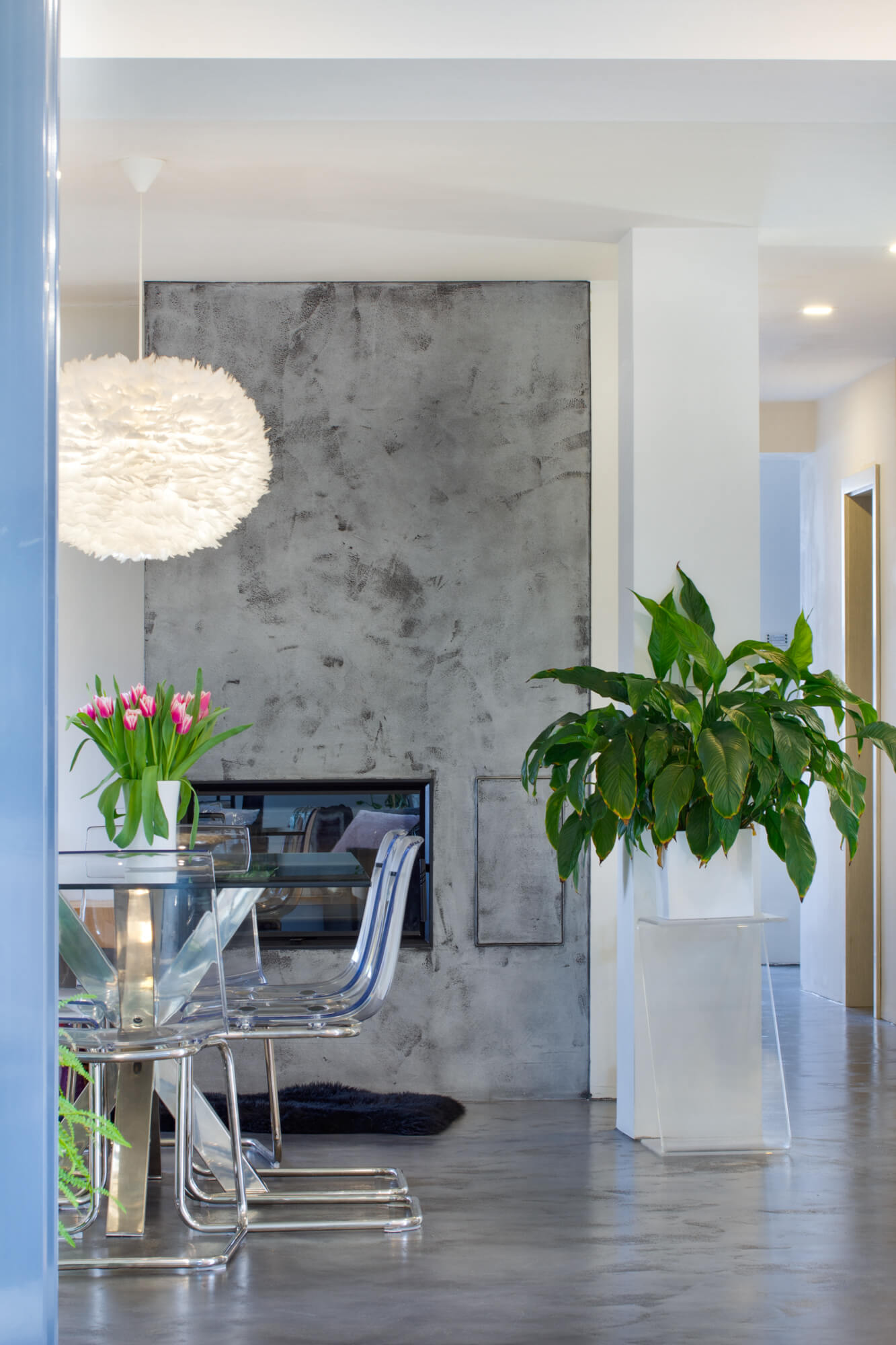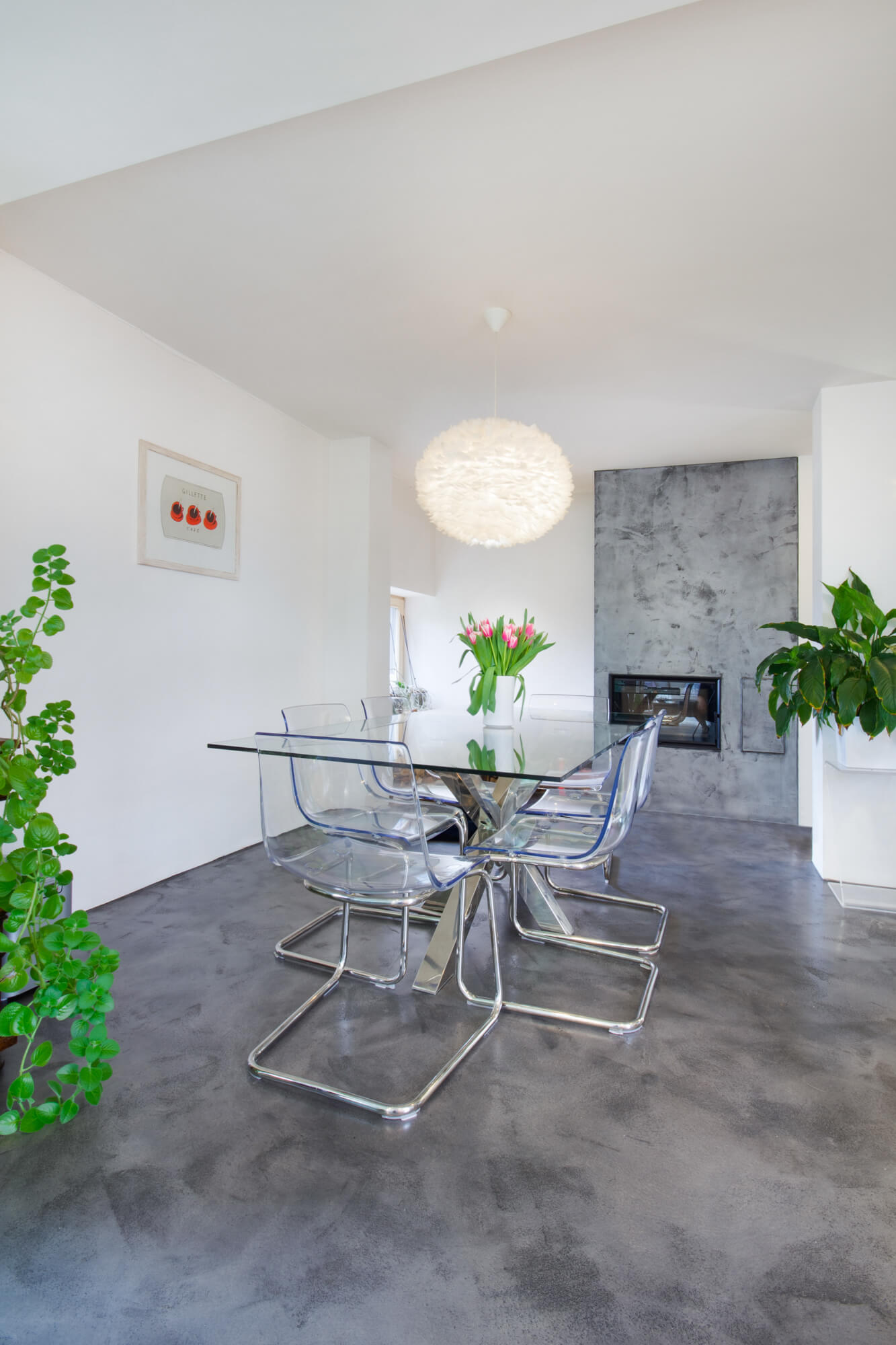 V tomto rodinném domě byla realizována betonová stěrka Betonepox®, která interiéru dodává moderní a nadčasový charakter. Povrch je přirozeně oživen jarně zelenými tóny živých rostlin, díky nimž působí prostor svěže, harmonicky a příjemně.