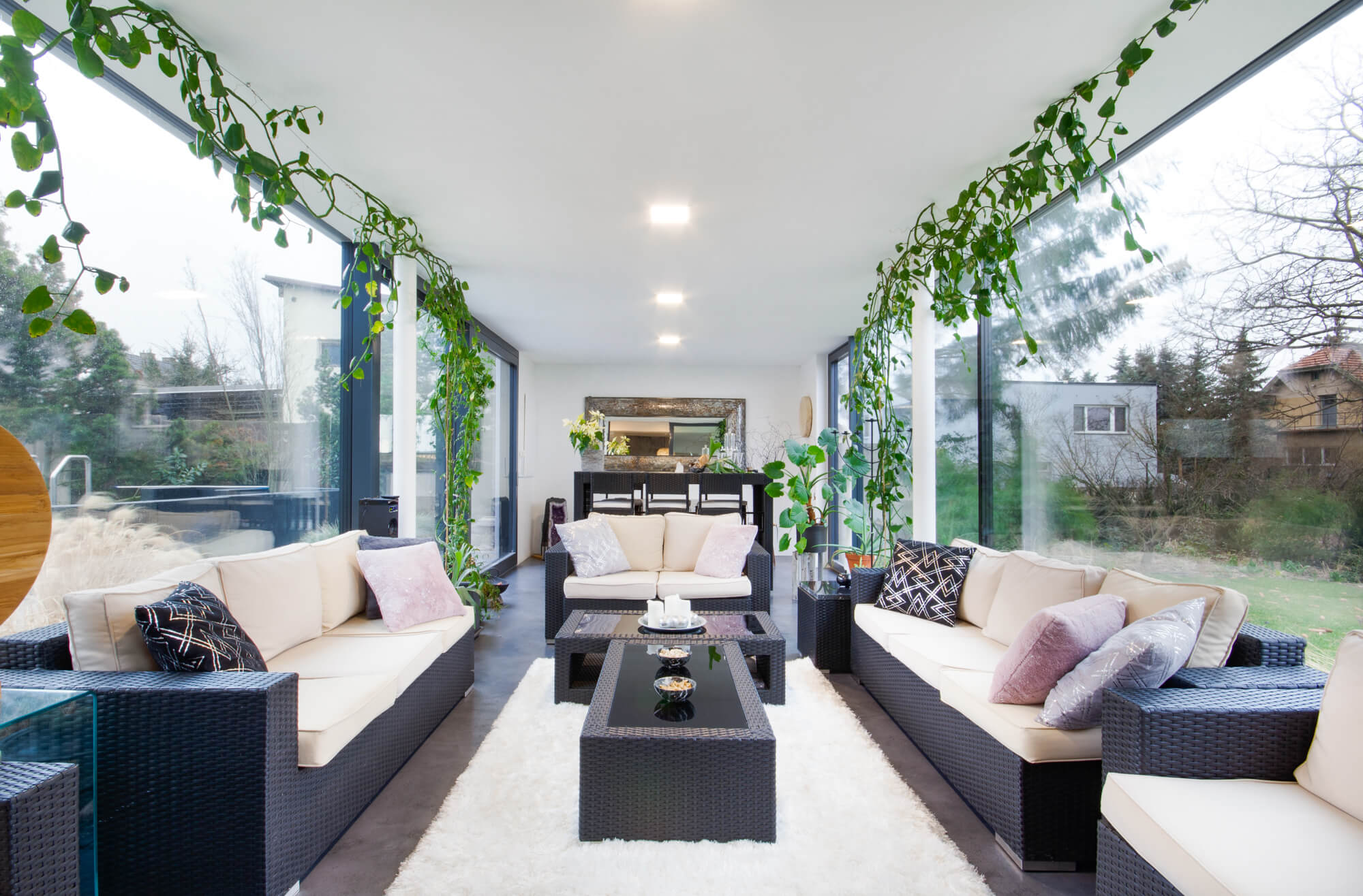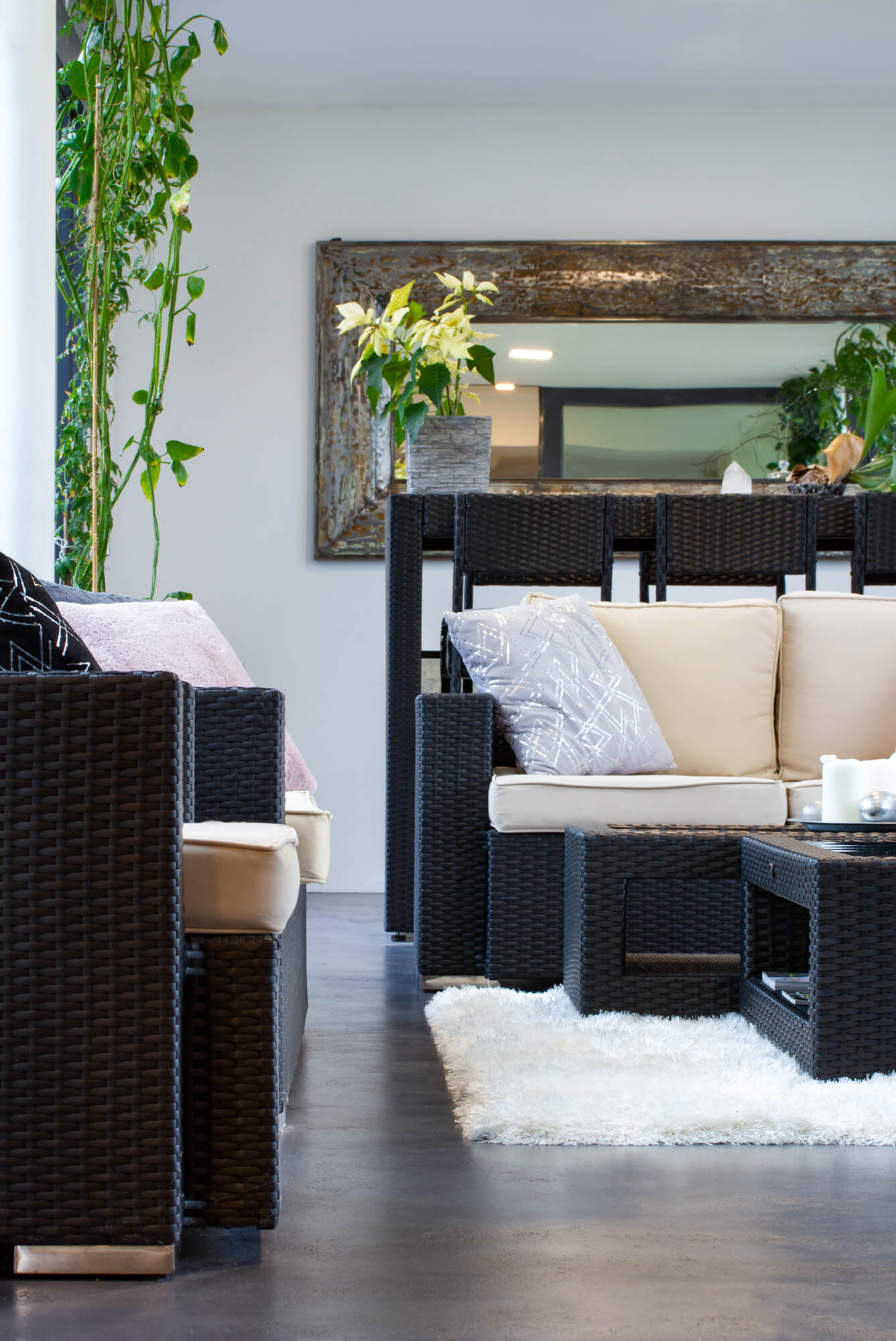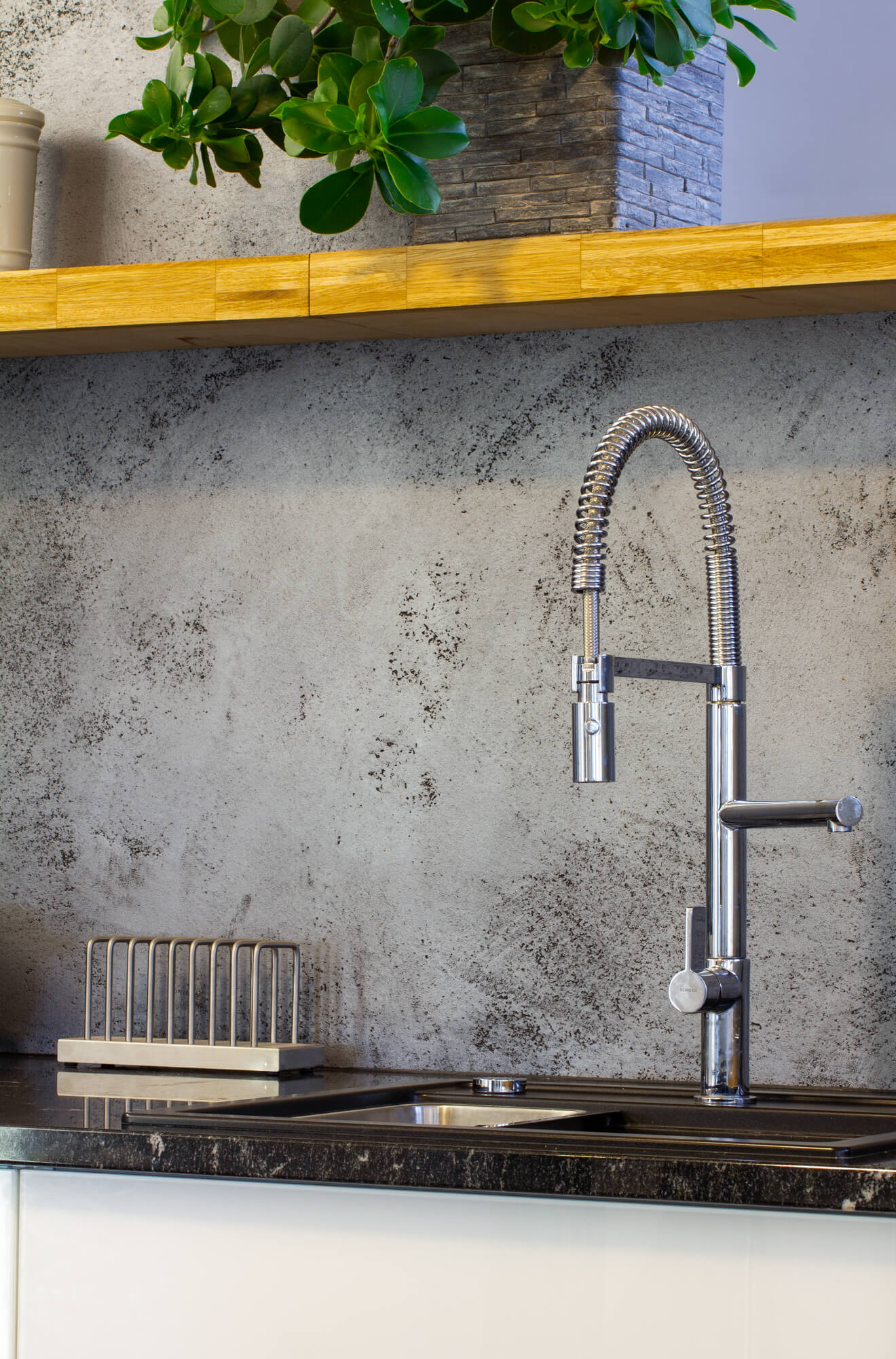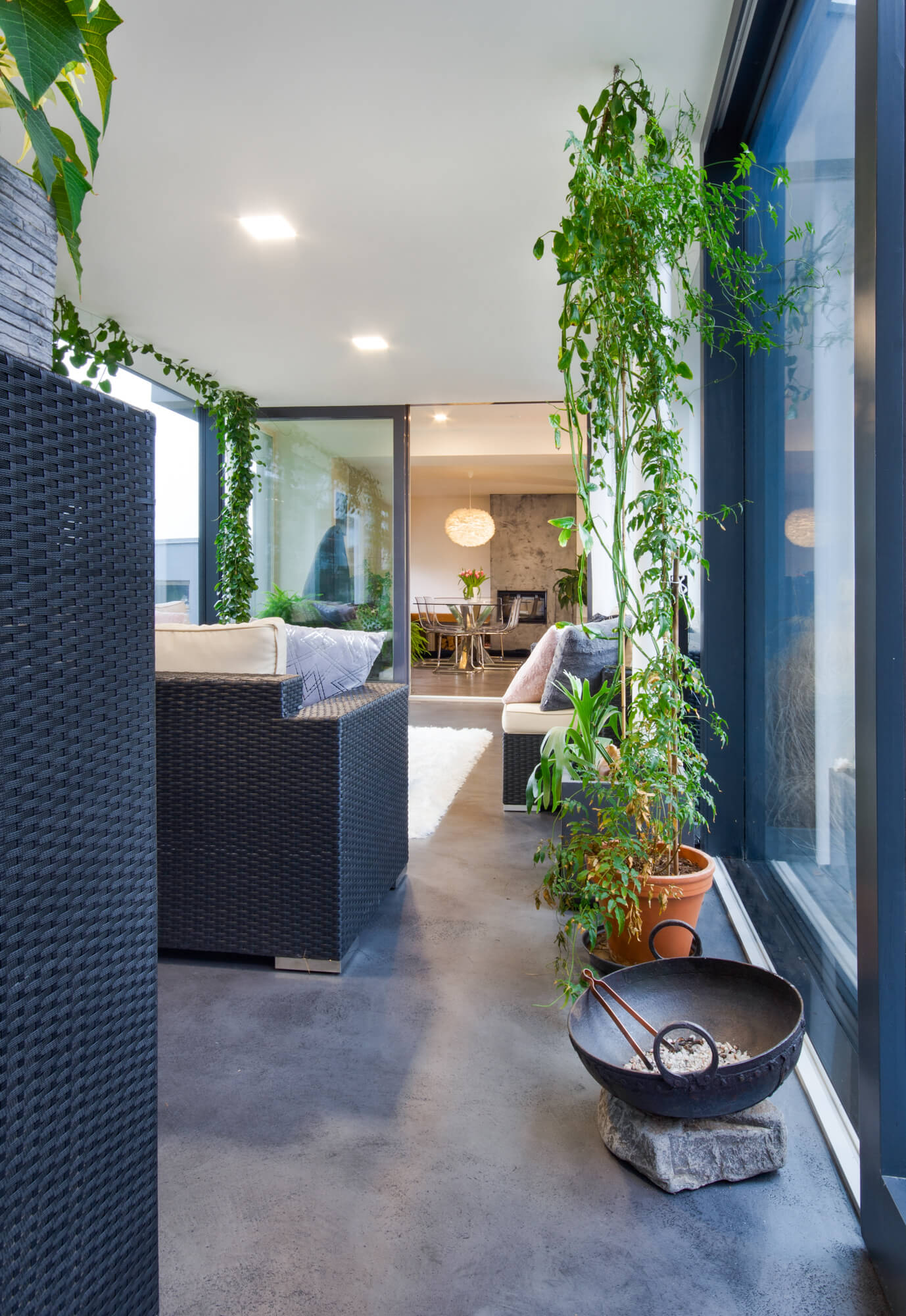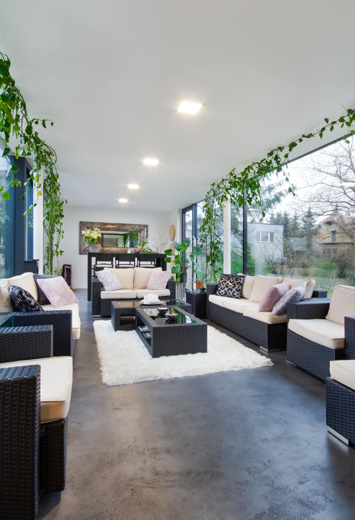 V tomto rodinném domě byla realizována betonová stěrka Betonepox®, která interiéru dodává moderní a nadčasový charakter. Povrch je přirozeně oživen jarně zelenými tóny živých rostlin, díky nimž působí prostor svěže, harmonicky a příjemně.