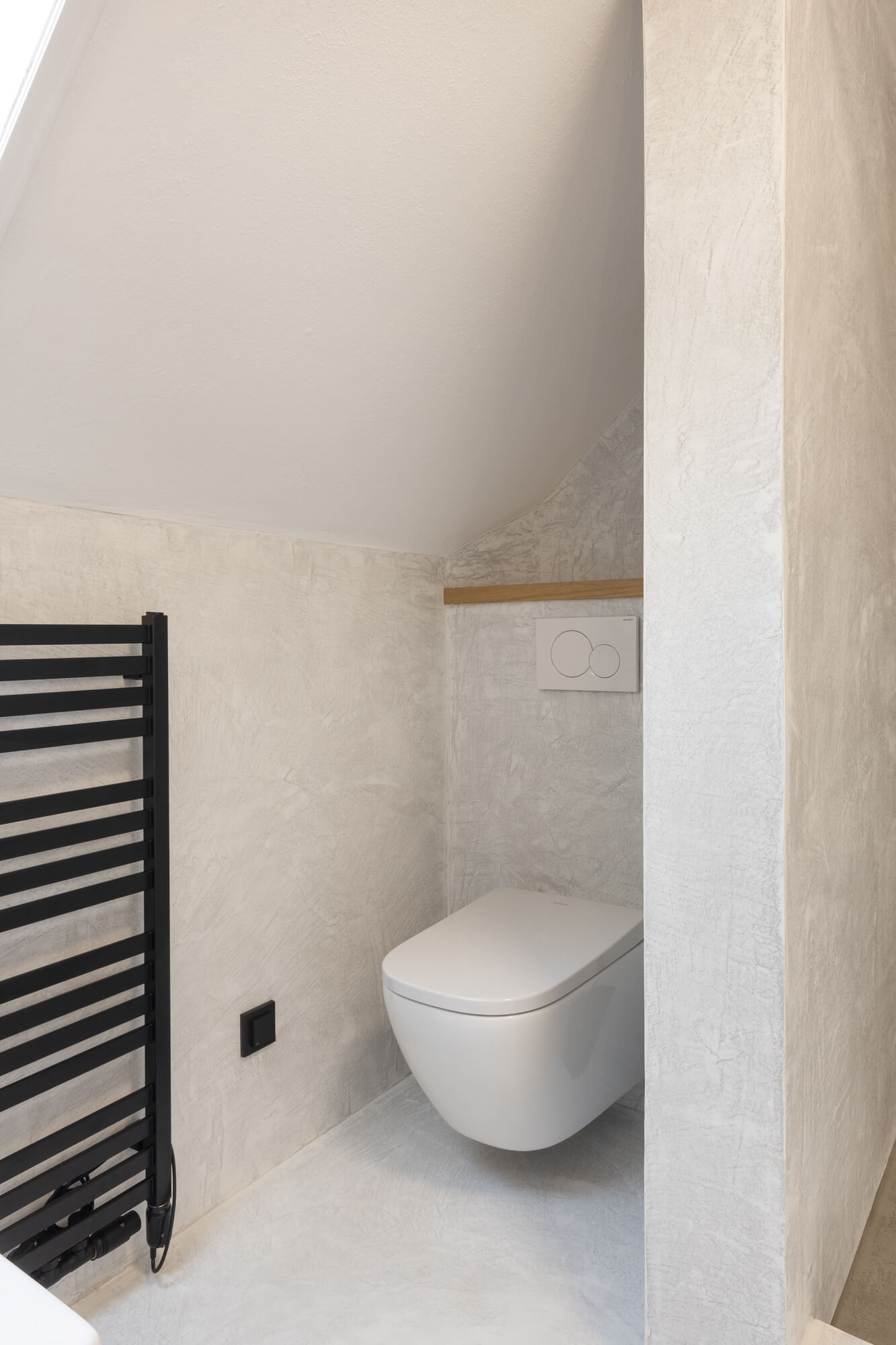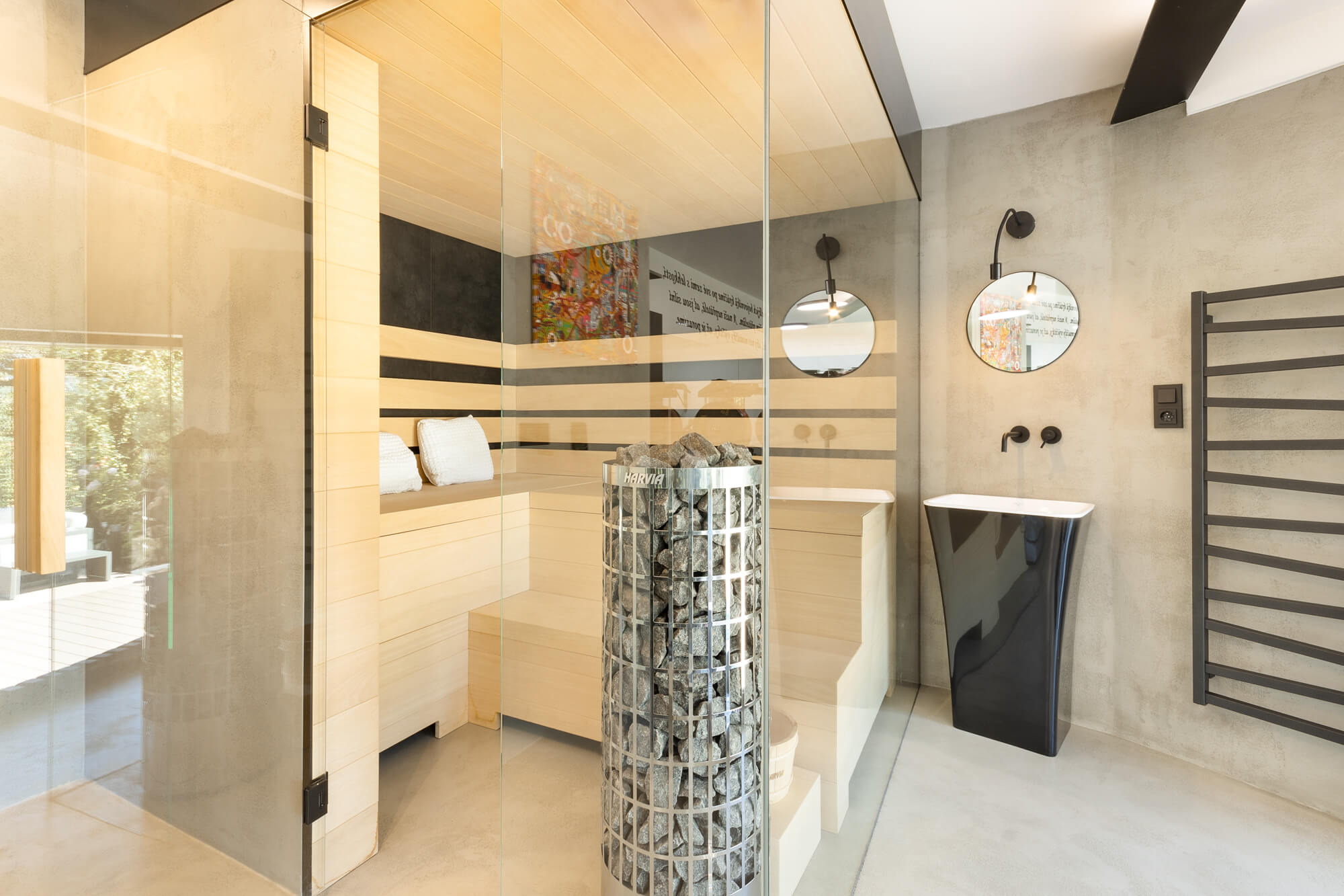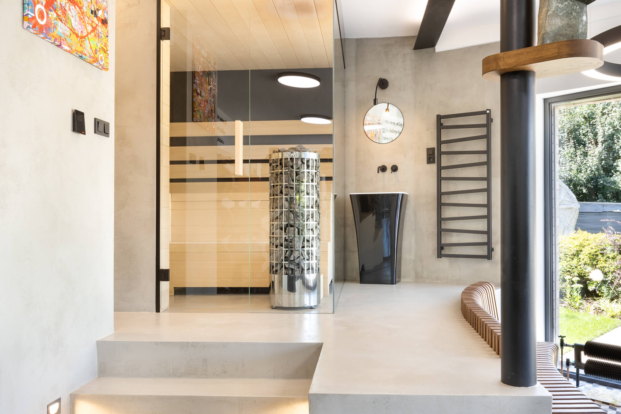 V prostorném interiéru tohoto rodinného domu na Vysočině jsme aplikovali stěrku Betonepox® Ultrasoft na podlahy a Betonepox® Classic na podlahy a stěny v okolí sauny. Tento odolný materiál s betonovým vzhledem vnesl do prostoru moderní a příjemnou atmosféru, která spojuje styl a pohodlí.