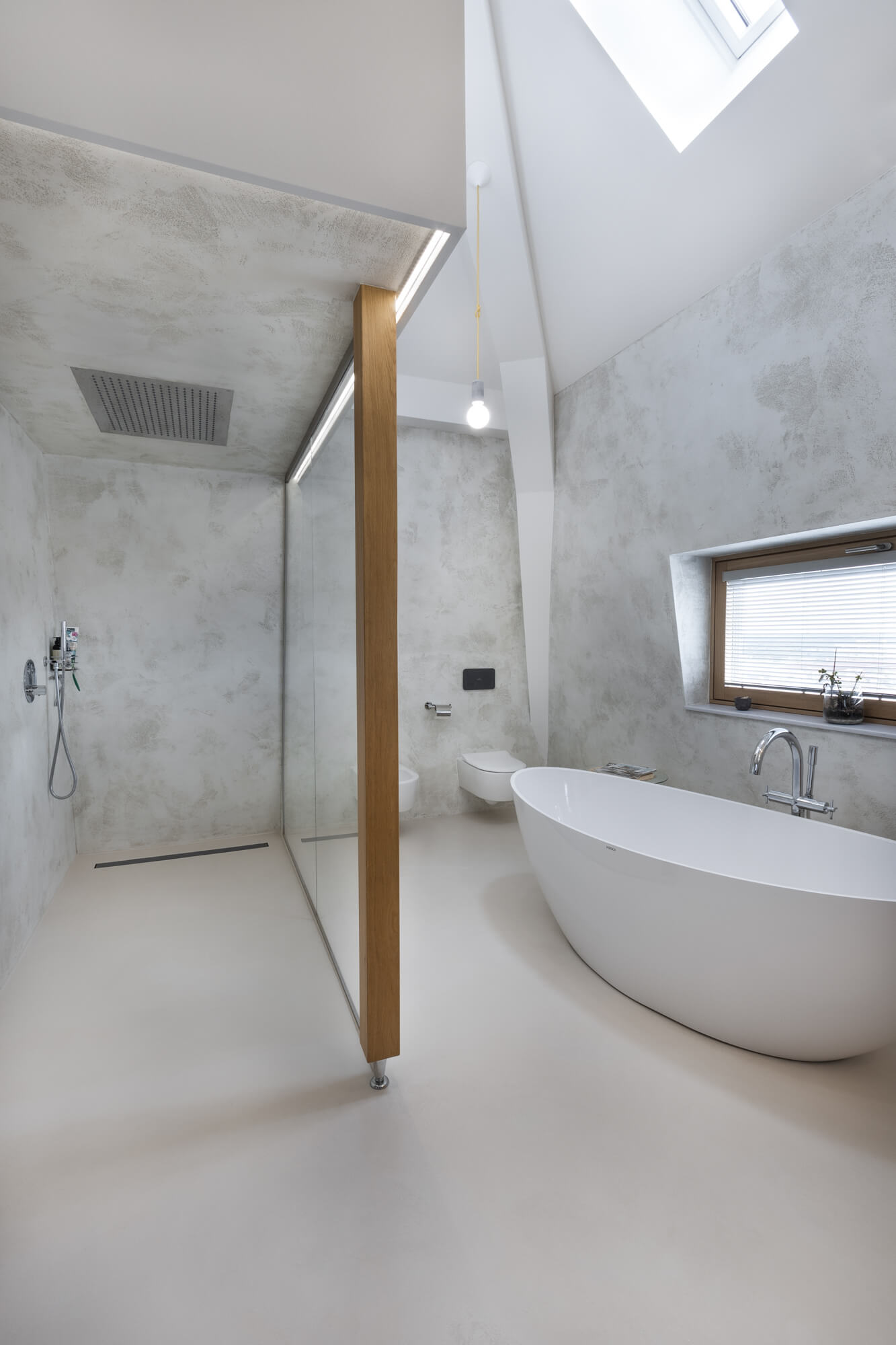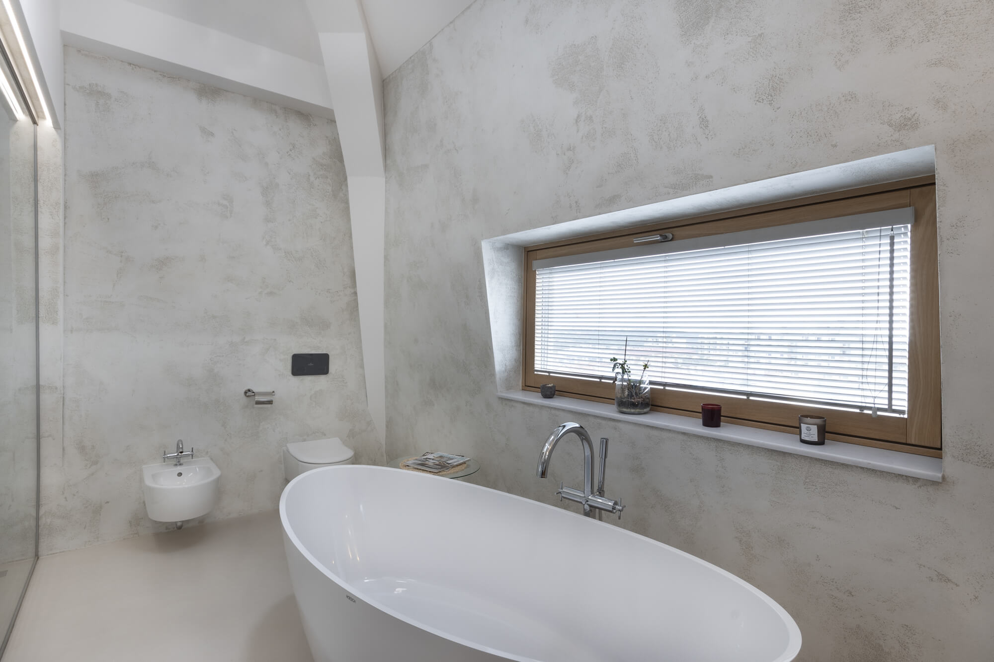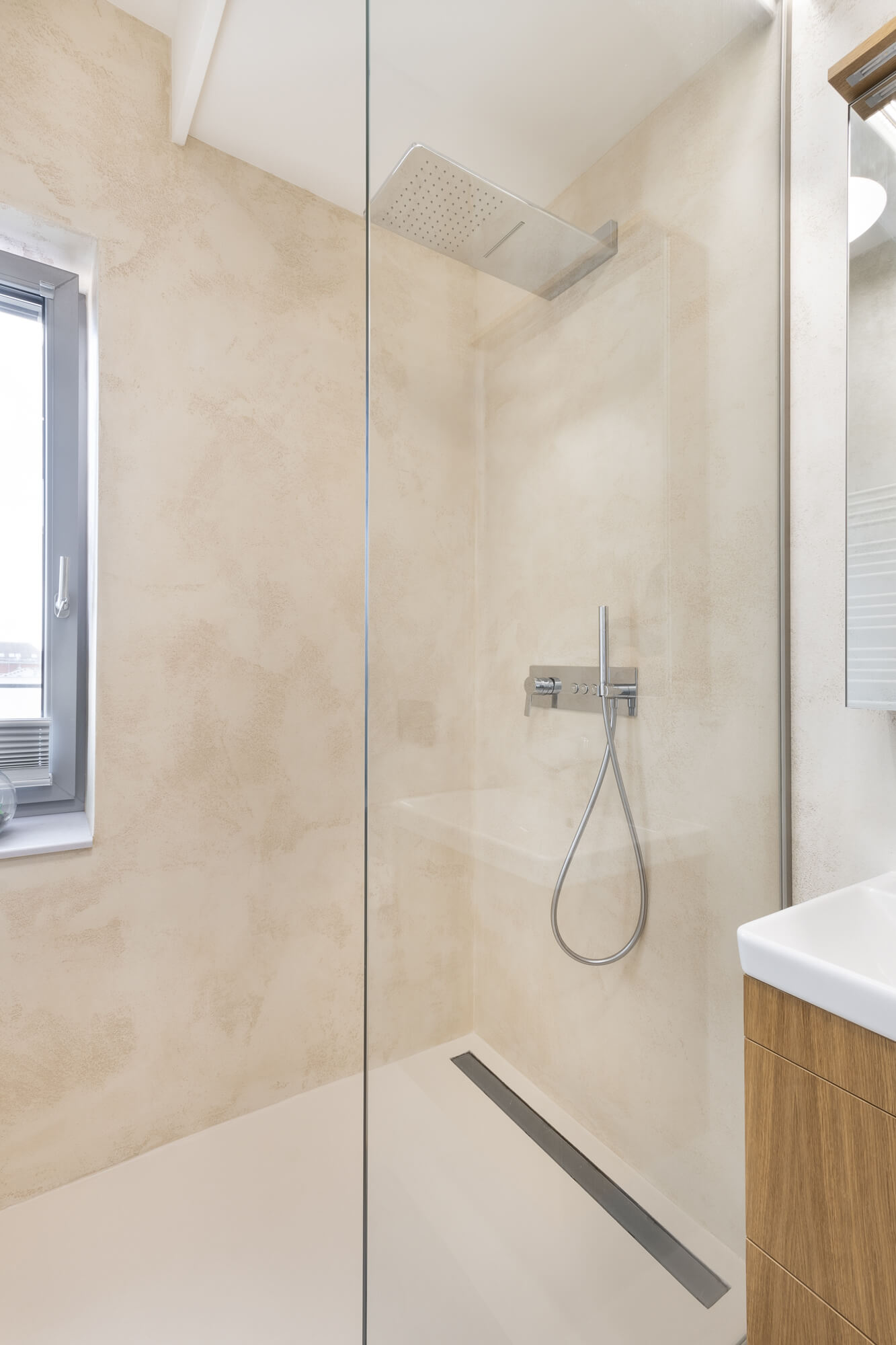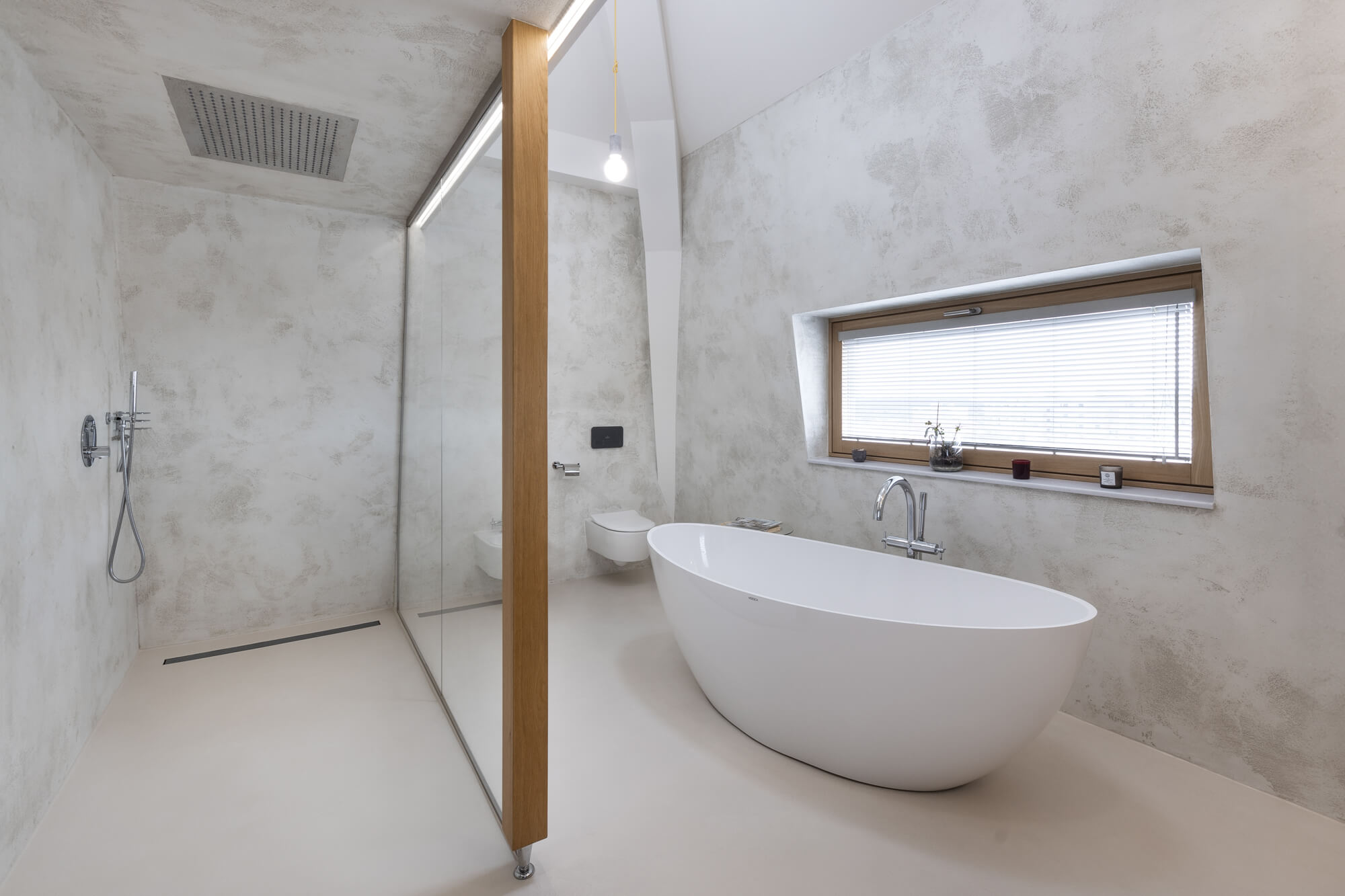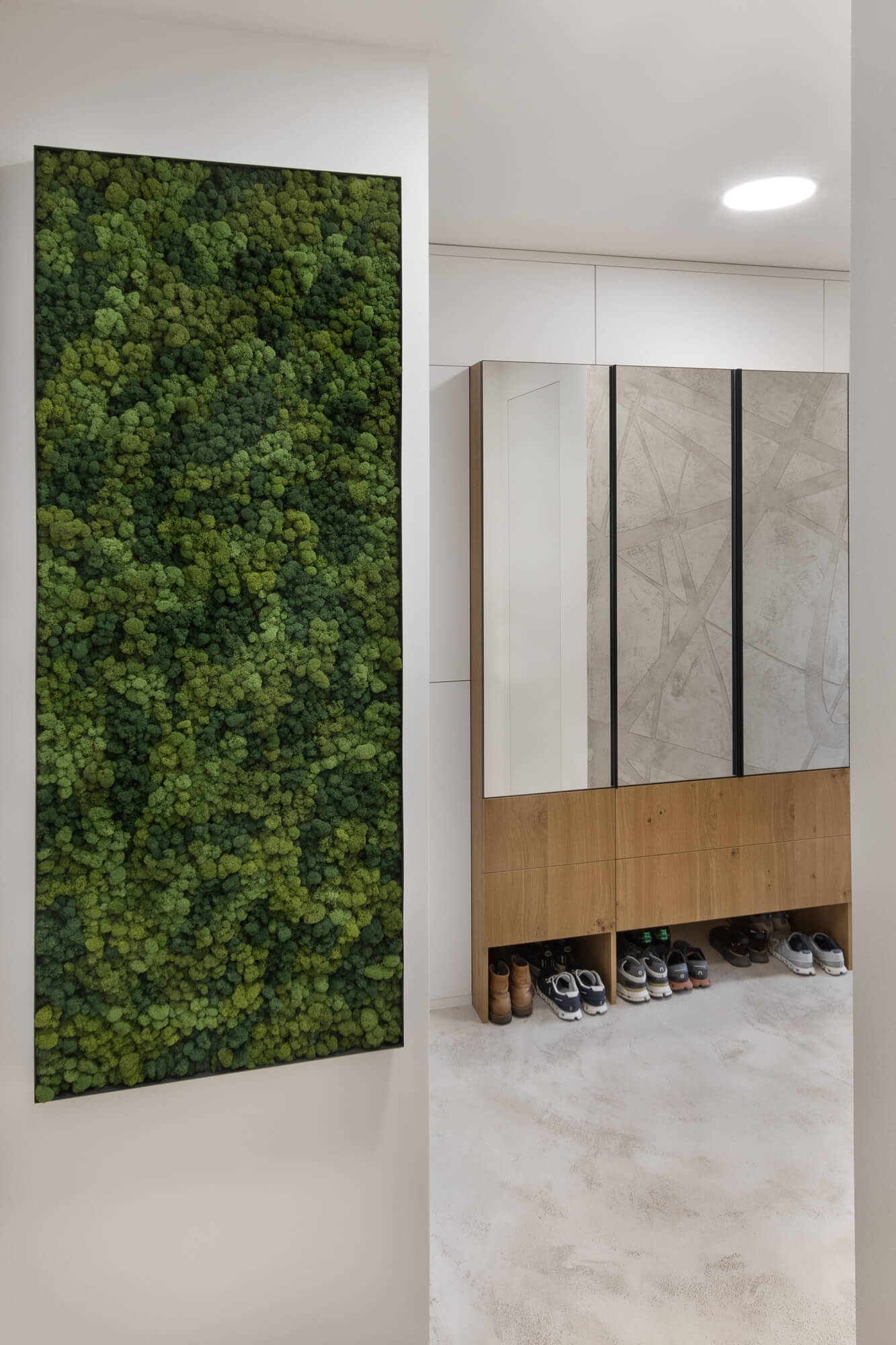 Krásu tohoto atypického prostoru podtrhla nadčasová stěrka Betonepox®. Díky její odolnosti a vzhledu to byla jasná volba. Prostor u vstupu navíc ozvláštnila stěrka Imitace betonu® s grafikou.